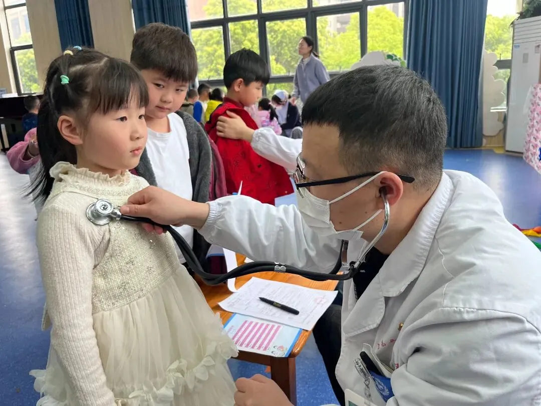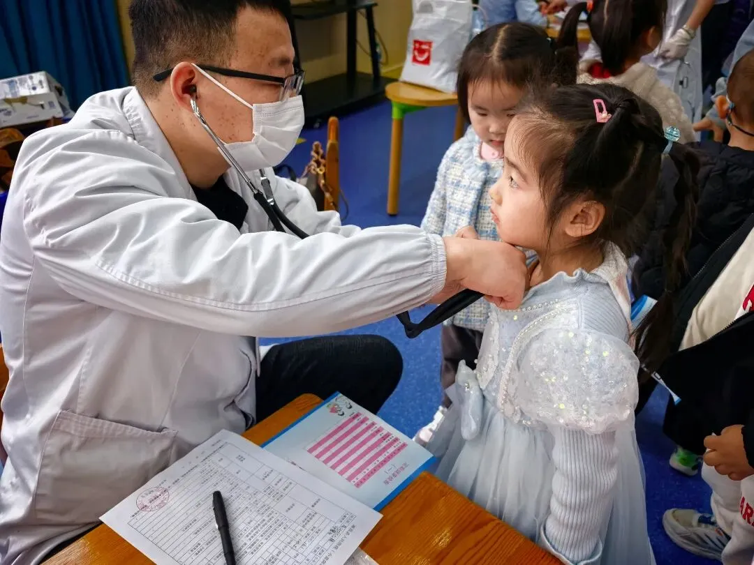 医生们用神奇的听诊器听听心肺,摁摁小肚子,看看皮肤,了解孩子们的生长发育情况。