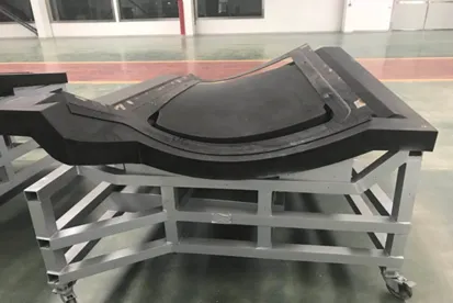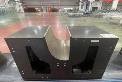 2. 零件较大导致自动铺带到热隔膜的转移过程困难; 3. 热隔膜成型过程中,能否一次热隔膜成型到位,厚度差较大易带来褶皱以及R角减薄效应无法避免; 6.零件尺寸较大,且厚度变化较大,导致厚度及轮廓度很难控制。针对以上问题,通过不断的优化制造方案,最终制造了合格的零件。模具表面由于是复合材料,在生产复合材料构件时,不可避免的会对模具成型表面造成划伤,后期比较难于修复;复合材料制造的成型模具成本高昂,一般使用100架次,造成其平摊成本高。通过在复合材料构件成型模具表面镀一层金属的方法来解决传统复合材模具的缺点,如图所示,为我司制造的某机翼前缘镍沉积复合材料成型模,背部设计复材框架。