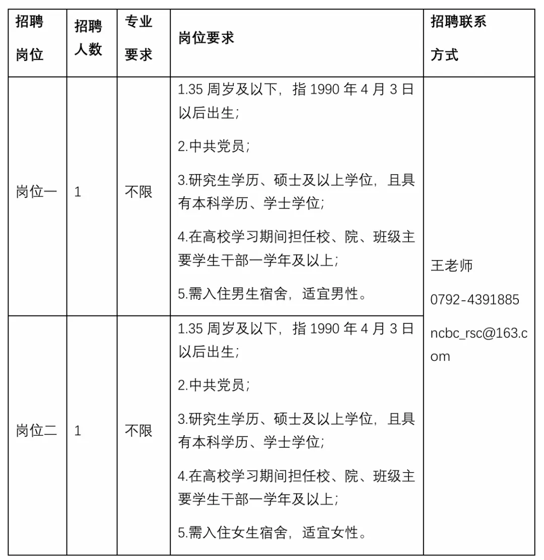 (二)岗位、人数、要求及联系方式一览表