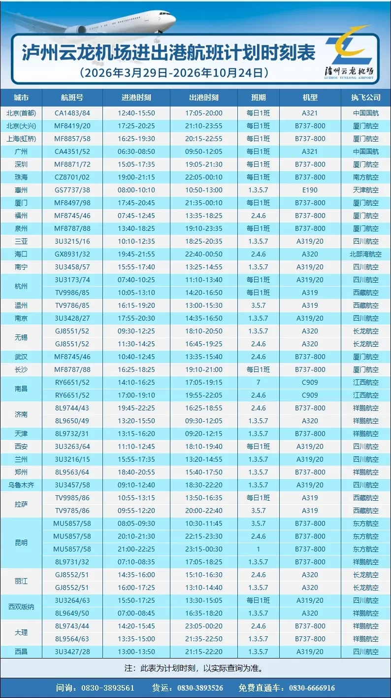 【泸州机场新航季】恢复兰州/无锡航线,加密拉萨/济南航班,优化北京/温州时刻...
