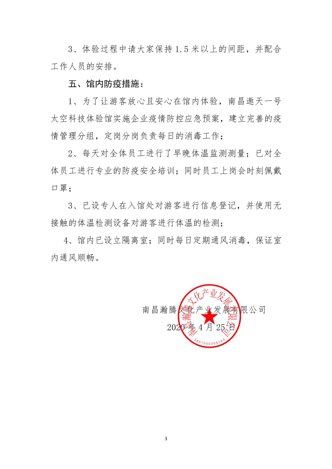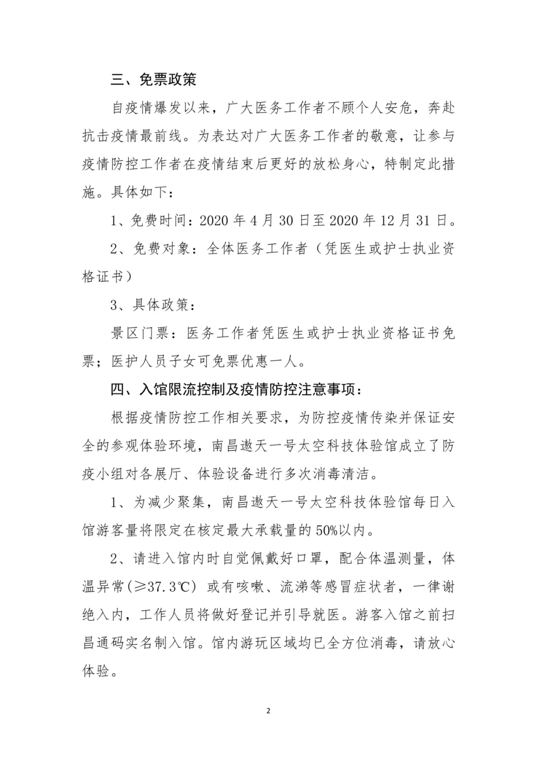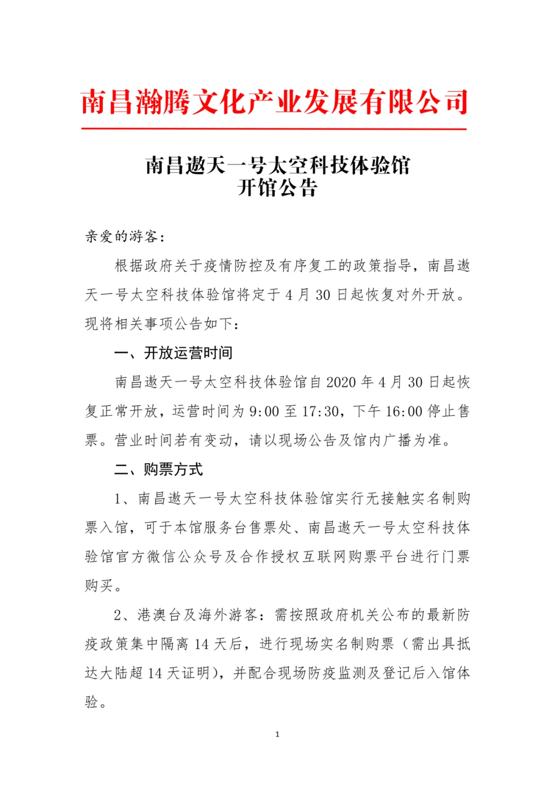 根据政府关于疫情防控及有序复工的政策指导,南昌遨天一号太空科技体验馆将定于4月30日起恢复对外开放。现将相关事项公告如下: