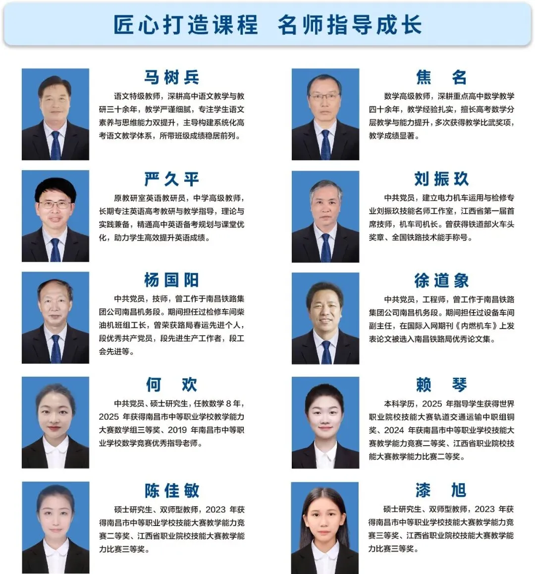 学校自创办以来一直专注铁路人才培养,是目前江西颇具特色的一所以轨道交通类为主的中等专业学校。学校已开设铁道运输服务、电气化铁道供电、电力机车运用与检修、工业机器人技术应用、航空服务、机电技术应用、新能源装备运行与维护、数字媒体技术应用等主要专业,涵盖装备制造、交通运输、电子信息等三大类专业。教育始于初心,成果源于用心,学校先后获得“南昌市优秀等级学校”“1+X证书联盟牵头学校”“江西省教育系统先进集体”“南昌市教育系统立德树人综合考核一等奖"等诸多荣誉。学校有五个专业被评为南昌市职业教育“精品特色专业”,三个工作室被评为“技能名师工作室”,学校多年来的办学成果备受社会赞誉,被誉为学生满意、家长放心的铁路轨道交通人才培养的摇篮!