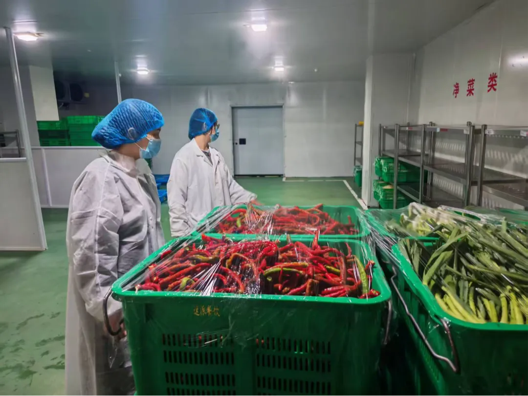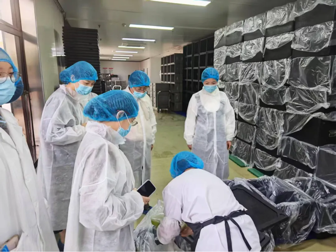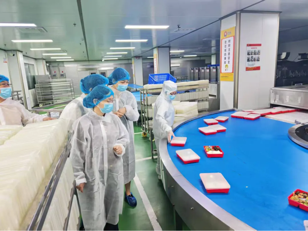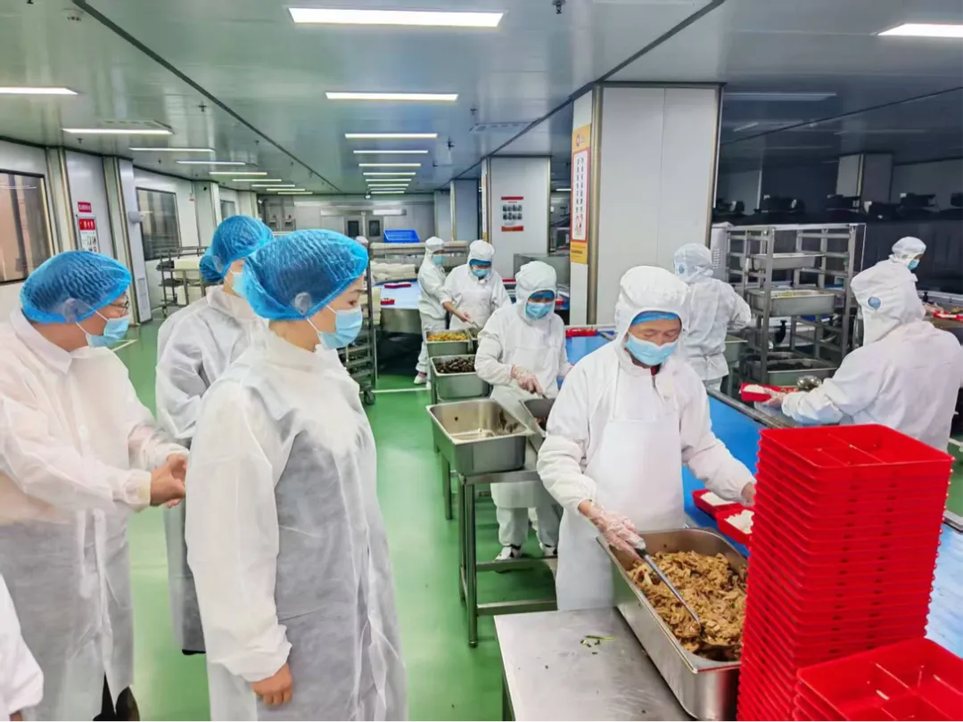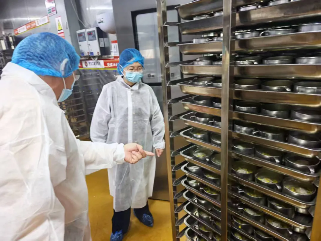 检查组一行严格按照食品生产卫生要求,穿戴专业防护隔离服,先后深入食材储藏间、餐食制作加工间等核心区域,实地查看食材储存环境、卫生条件及餐食全流程制作规范。