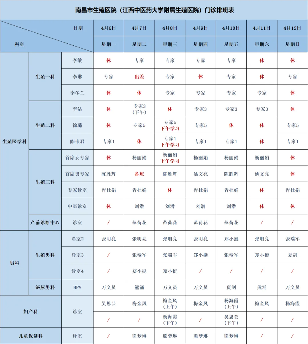 【出诊信息通知】南昌市生殖医院门诊医生排班表 (4月6日~4月12日门诊排班)