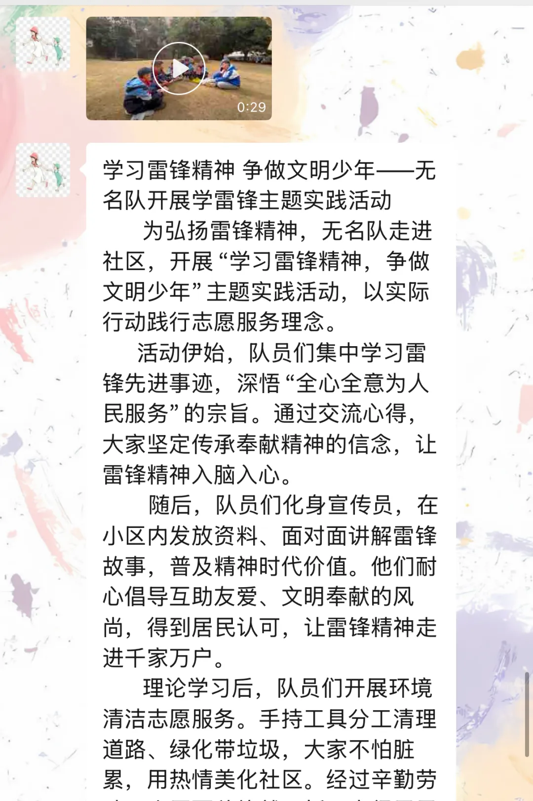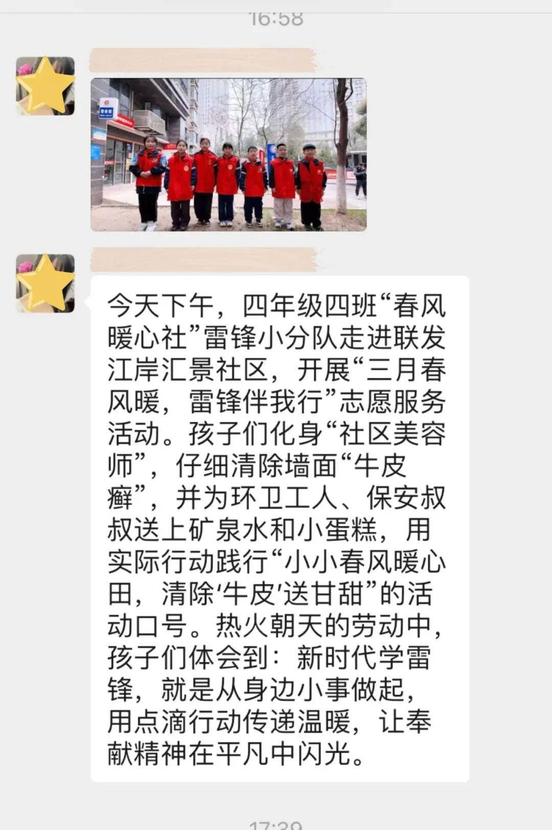 此次雷锋月主题系列活动,不仅深化了全体学生对雷锋精神的理解与认同,更推动学雷锋行动从阶段性主题活动,转化为学生根植于心、外化于行的日常行为习惯。活动虽已落幕,但雷锋精神的传承永无止境。我校将以此次活动为新起点,持续把雷锋精神深度融入日常德育体系与学生综合评价体系,让雷锋精神在校园持续绽放光芒,引领学生从 “追光者” 稳步成长为传递温暖的“发光者”。