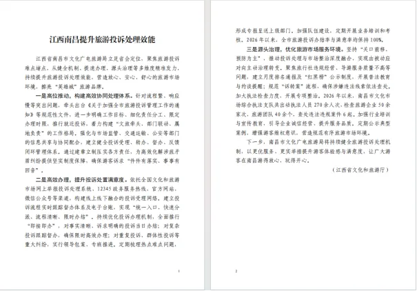 江西省南昌市文化广电旅游局立足省会定位,聚焦旅游投诉难点堵点,从健全机制、提速办理、源头治理等多维度精准发力,持续提升旅游投诉处理效能,营造放心、安心、舒心的旅游市场环境,擦亮“英雄城”旅游品牌。