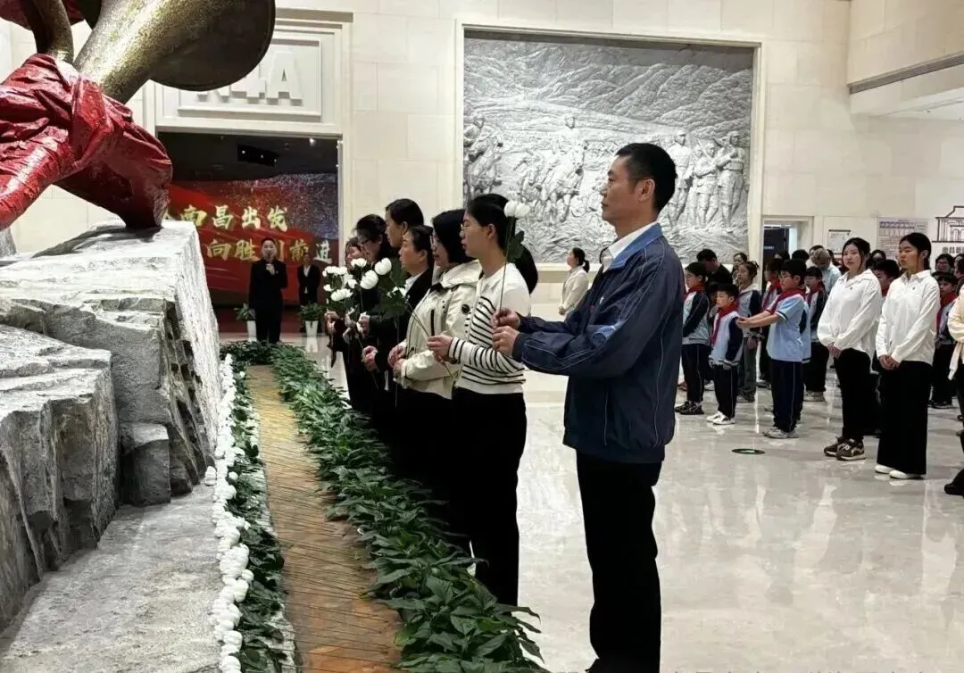 活动现场,庄严肃穆。在“铁军出征”雕塑前,全体人员整齐列队,手持洁白鲜花,向革命先烈致以崇高的敬意。默哀仪式结束后,党员及妇联成员缓步上前,小心翼翼地将手中的白花敬献于雕塑基座前,以最真挚的方式寄托对英烈的哀思与追思。