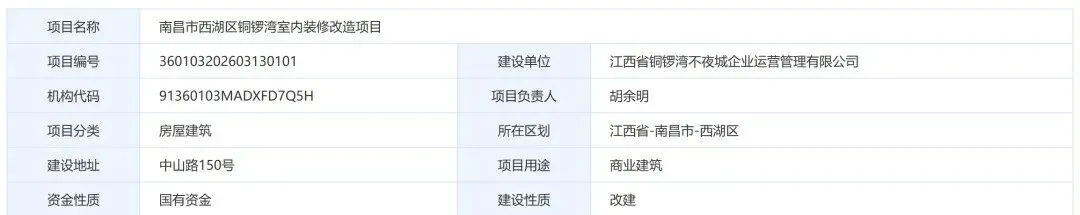 从相关平台了解到,南昌市西湖区铜锣湾室内装修改造项目正式进行了建档,项目编号为360103202603130101,项目建设单位为江西省铜锣湾不夜城企业运营管理有限公司。项目建筑面积约19728.43平方米,本项目涉及顶面吊顶、墙地砖铺贴、涂饰(乳胶漆)、轻质隔墙、给排水、暖通、电气安装、消防改造等工程。