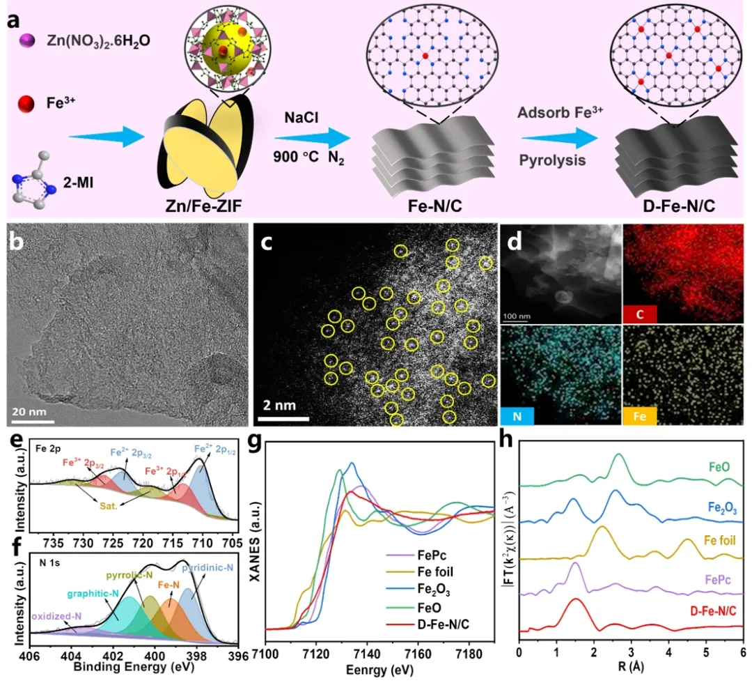 4. 此外,通过预设空气流通层所制备的叠片式锌-空气电池的最大功率密度达到了122.6 mW cm-2,能量密度达到337.25 Wh L-1,循环寿命也超过了520 h,并且还展现出优异的温度自适应性(-40~60 °C)。本工作通过盐模板辅助热解策略制备出了高比表面积且全开放片状结构的前驱体材料(Fe-N/C),然后吸附金属盐,通过两步热解策略得到高负载的铁基单原子催化剂(D-Fe-N/C)。扫描电镜(SEM)、透射电镜(TEM)和球差电镜(AC-HAADF-STEM)显示,D-Fe-N/C呈现出片状结构,并负载了高密度的Fe单原子。X射线光电子能谱(XPS)显示,D-Fe-N/C中存在较多的Fe-N和吡啶氮,且不存在属于金属铁颗粒的Fe0峰。同步辐射X射线吸收谱(XAFS)证明,D-Fe-N/C中的Fe元素是以单原子的形式存在。图1 催化剂的制备方法及形貌与结构表征