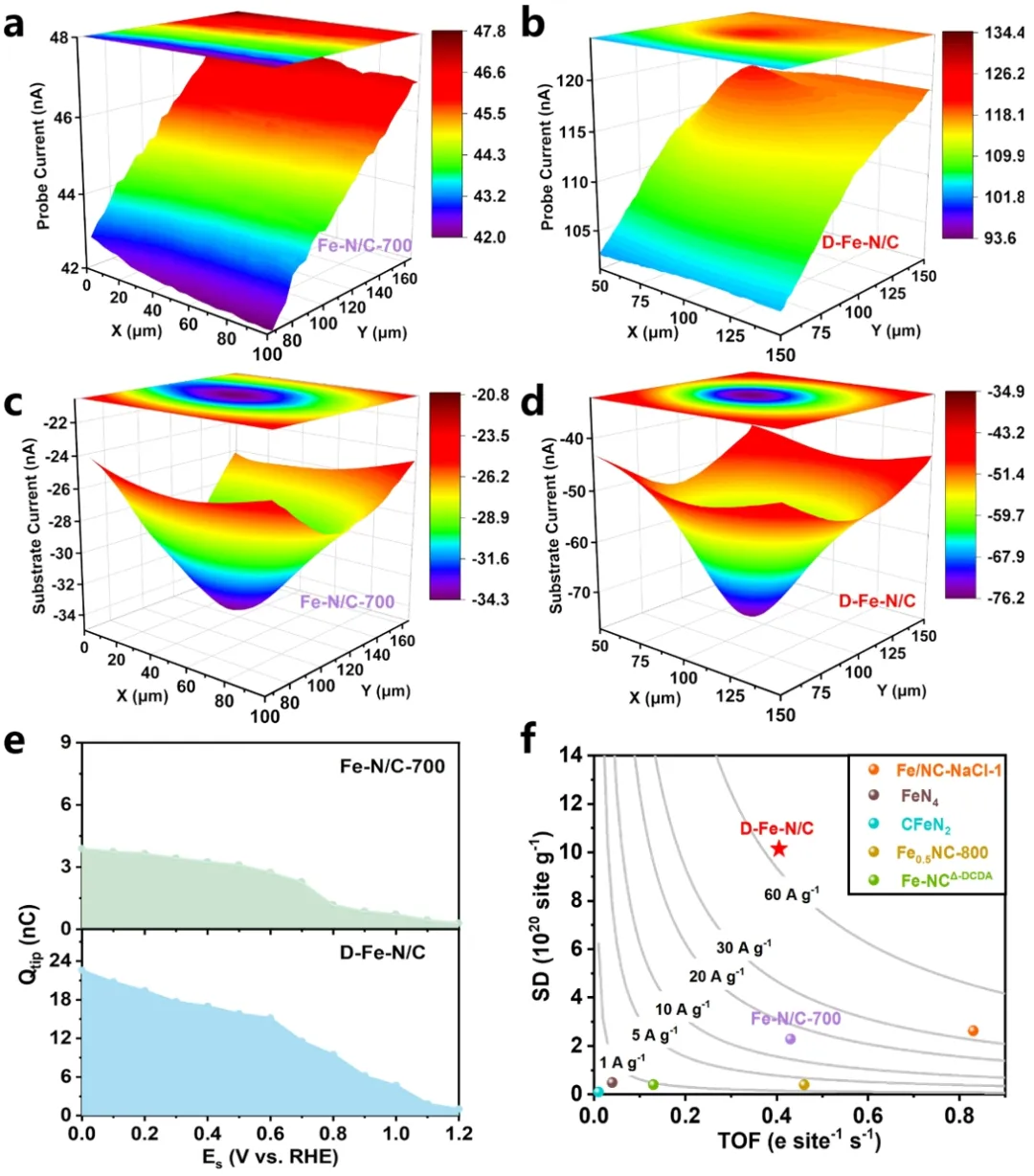 0.4 V时,D-Fe-N/C的反馈电流为76.2 nA,优于Fe-N/C-700的反馈电流为34.3 nA,这一结果很好地证明D-Fe-N/C具有更快的ORR动力学。随后,采用表面询问电化学扫描显微镜(SI-SECM)技术,对催化剂中真正参与电催化反应的活性位点密度(SD)进行定量表征。结果表明,D-Fe-N/C的位点密度(SD)高达1.01