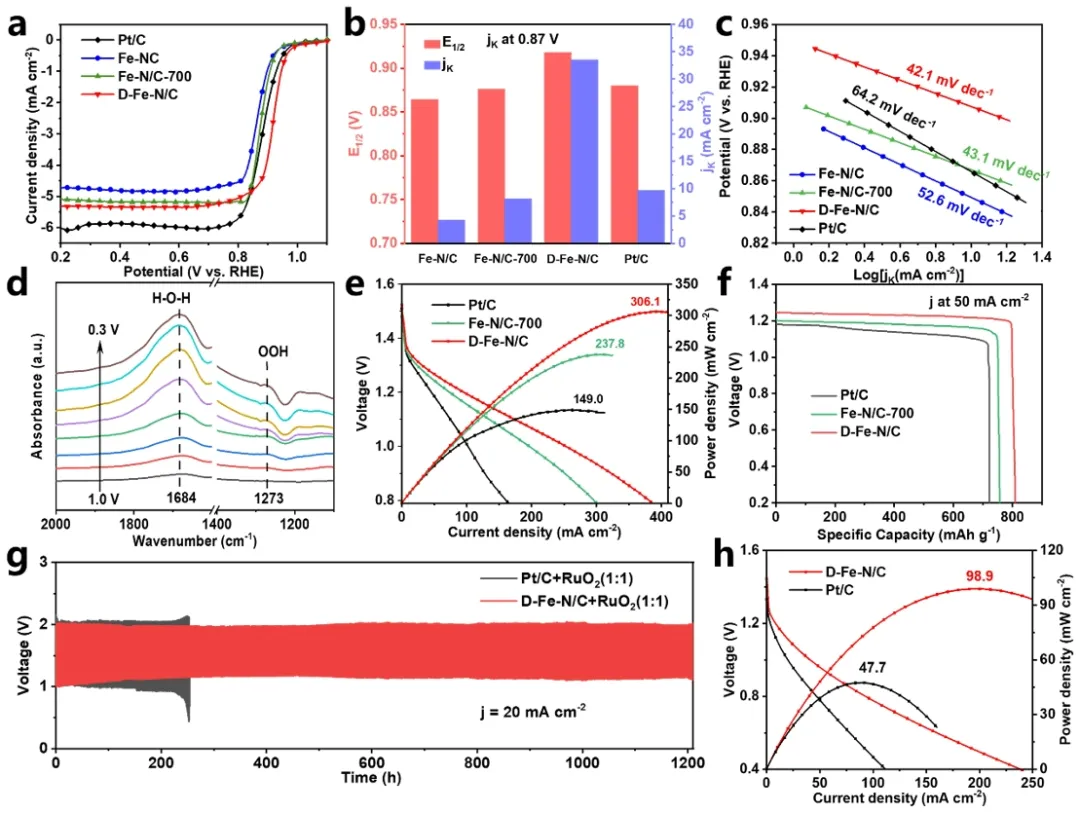 V (vs RHE)。此外,在众多对比样品中,D-Fe-N/C具有最高的动力学电流密度(jk@0.87V),最低的塔菲尔斜率。原位红外射线光谱(ATR-SEIRAS)结果表明,与Fe-N/C-700相比,D-Fe-N/C与水分子的相互作用更强,反应位点更丰富,从而增强了D-Fe-N/C的ORR活性。此外,以D-Fe-N/C为正极催化剂,组装了液态锌-空气电池,最大功率密度达到了306.1 mW cm-2,比容量达到了811.1 mA h g-1,循环寿命超过1200 h。由D-Fe-N/C所组装的锌-空气电池性能远超过由Pt/C所组装的锌-空气电池。图3 电化学性能测试及器件性能测试