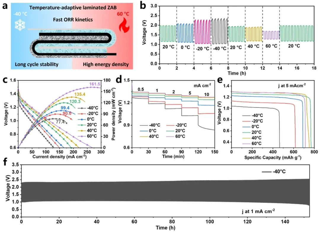 °C内,叠片式锌-空气电池的电压间隙随着温度的变化而变化,展现出优异的温度自适应性。随着温度从-40 °C升高到60 °C,功率密度逐渐从77.4 mW cm-2提高到161.5 mW cm-2。叠片式锌空气电池展现出优异的倍率性能和稳定的放电特性。即使在-40 °C,叠片式锌空气电池的循环寿命依旧达到了150 h,表现出出色的稳定性。图5 叠片式锌-空气电池在宽温度范围内的电化学性能测试