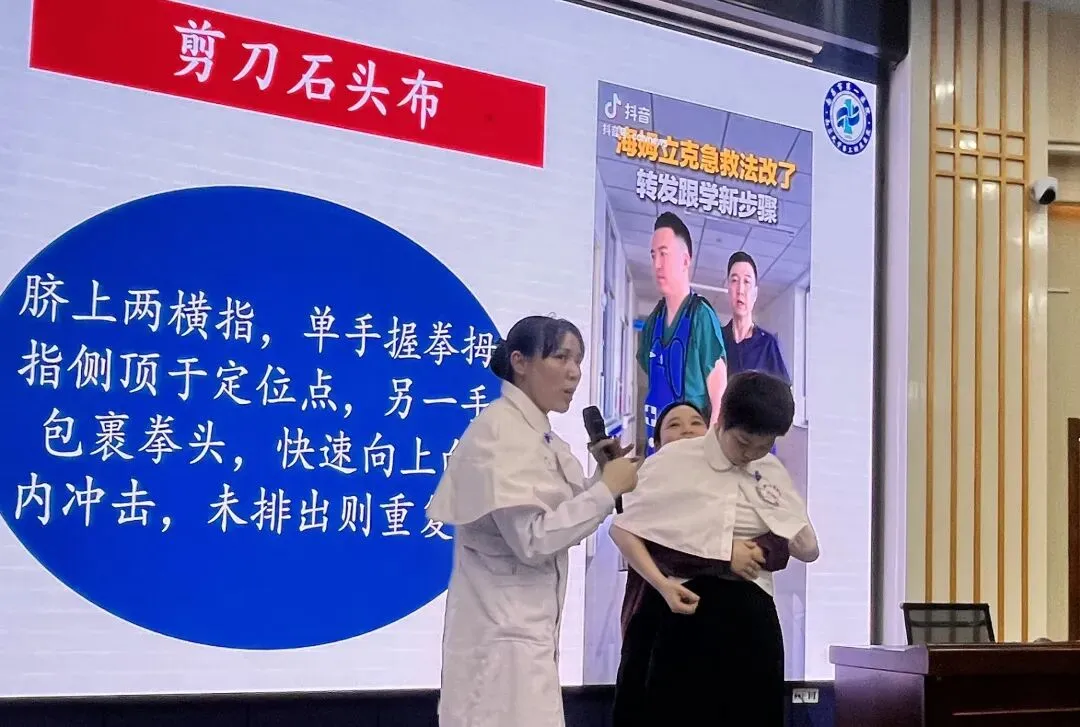 针对校园高发的气道异物梗阻问题,黄芳导师重点教学了海姆立克急救法,示范了成人与儿童的不同施救姿势,精准讲解了发力部位与冲击技巧,帮助学生快速掌握异物卡喉时的紧急处置方法。