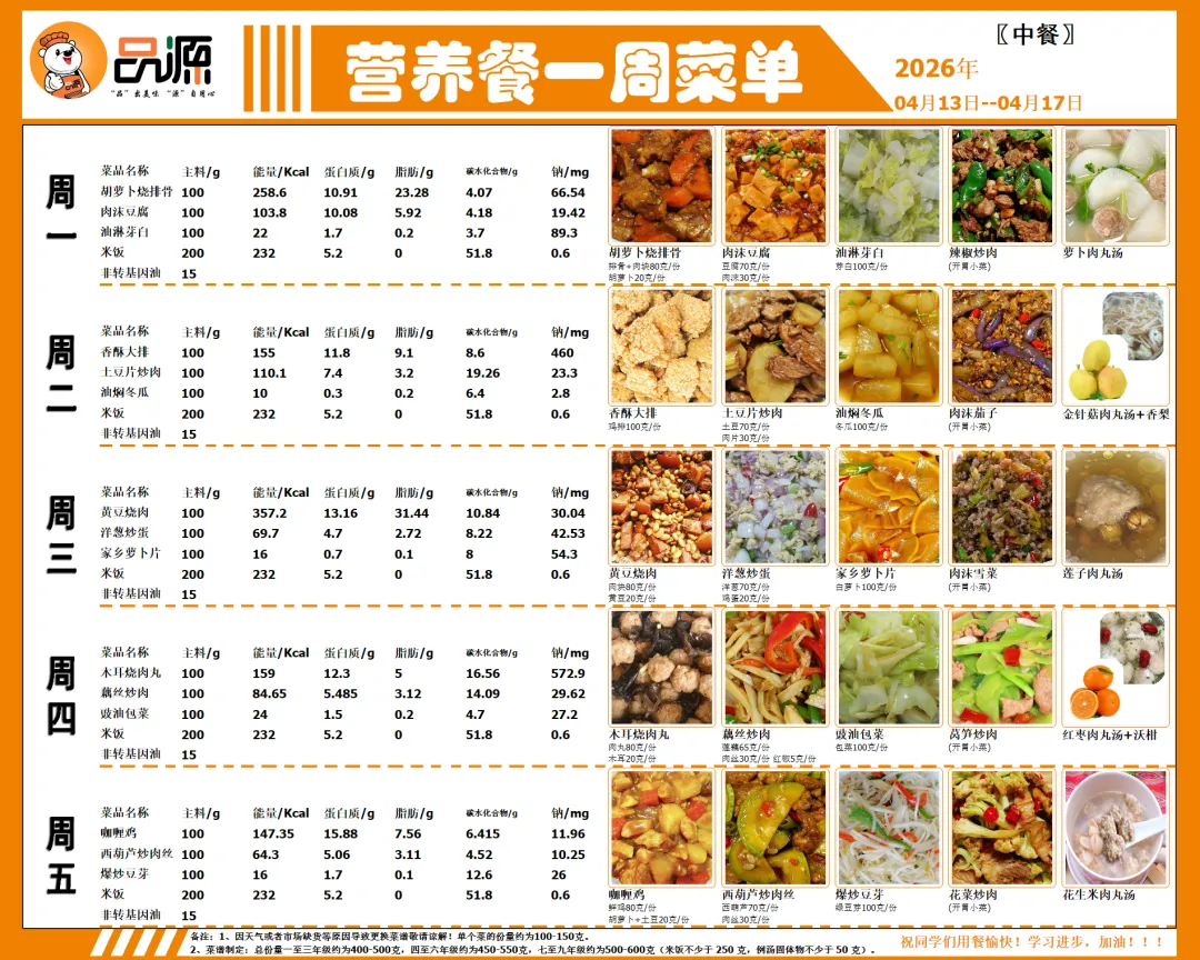 【第七周(2026年4月13日-4月17日)带量食谱公示】