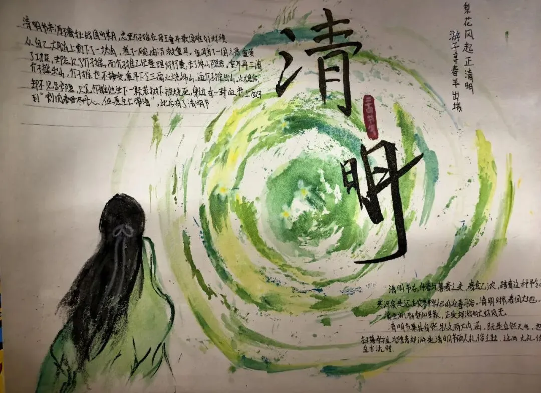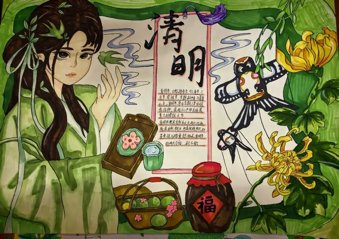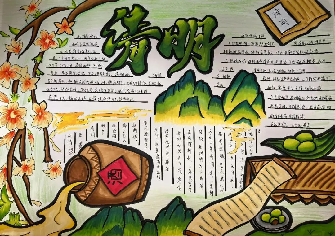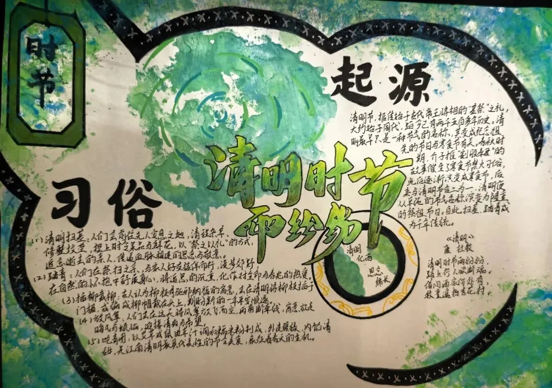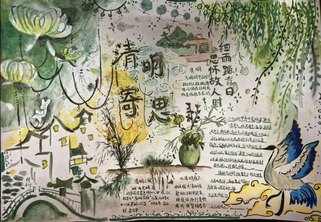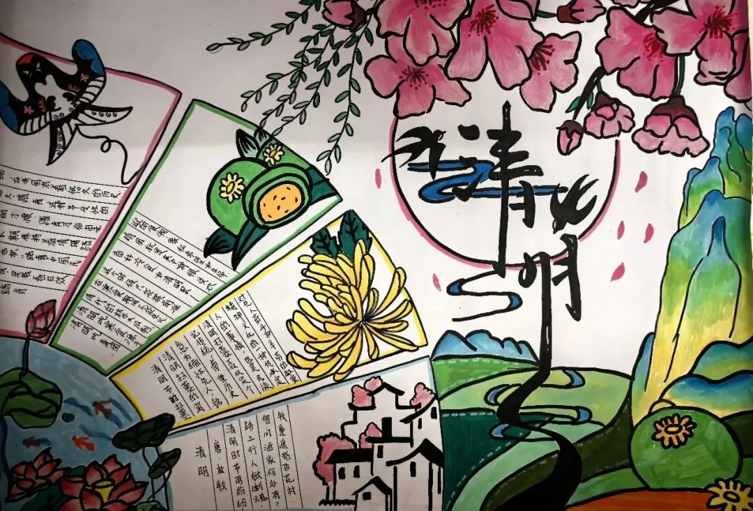 同学们踊跃参与、匠心创作,以缅怀先烈、春日踏青、诗词雅韵、民俗传承为核心,巧思构图、精设版面,用灵动的色彩勾勒踏青插柳的盎然意趣,以工整的笔墨书写扫墓祭祖的肃穆深情,将经典诗词的隽永韵味、传统习俗的文化内涵、英烈事迹的精神力量,一一铺展于纸端。