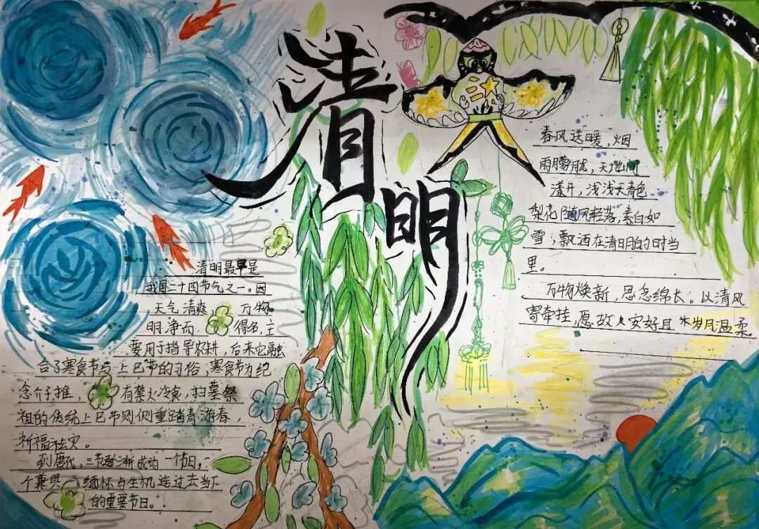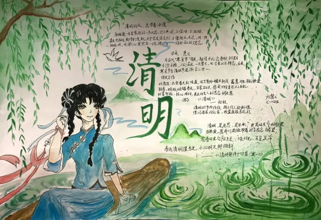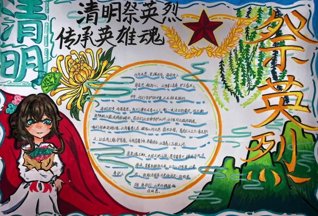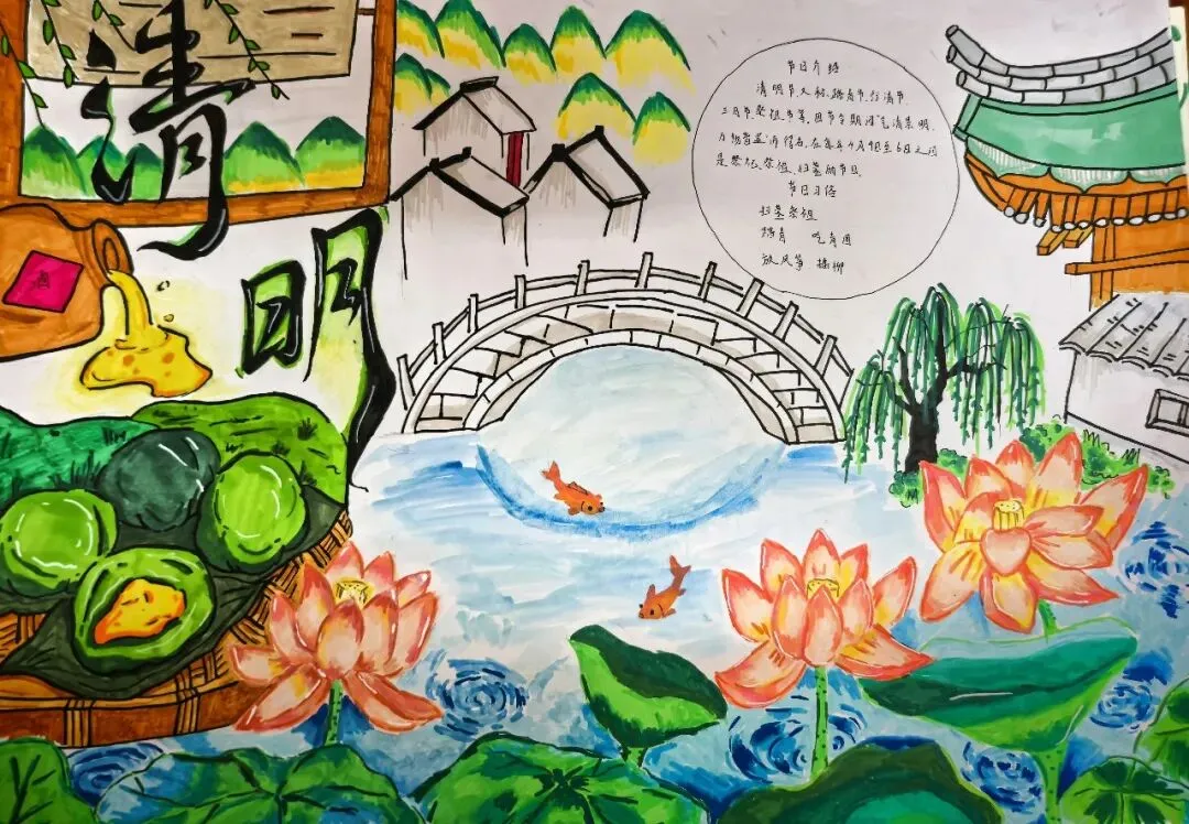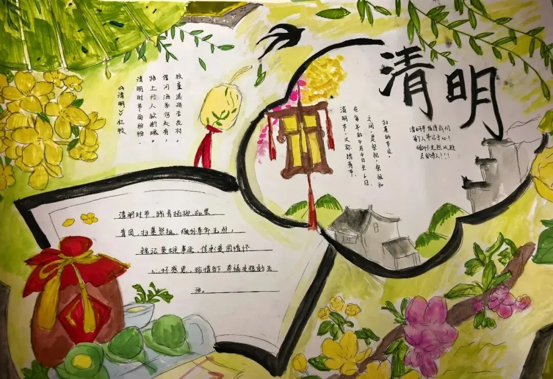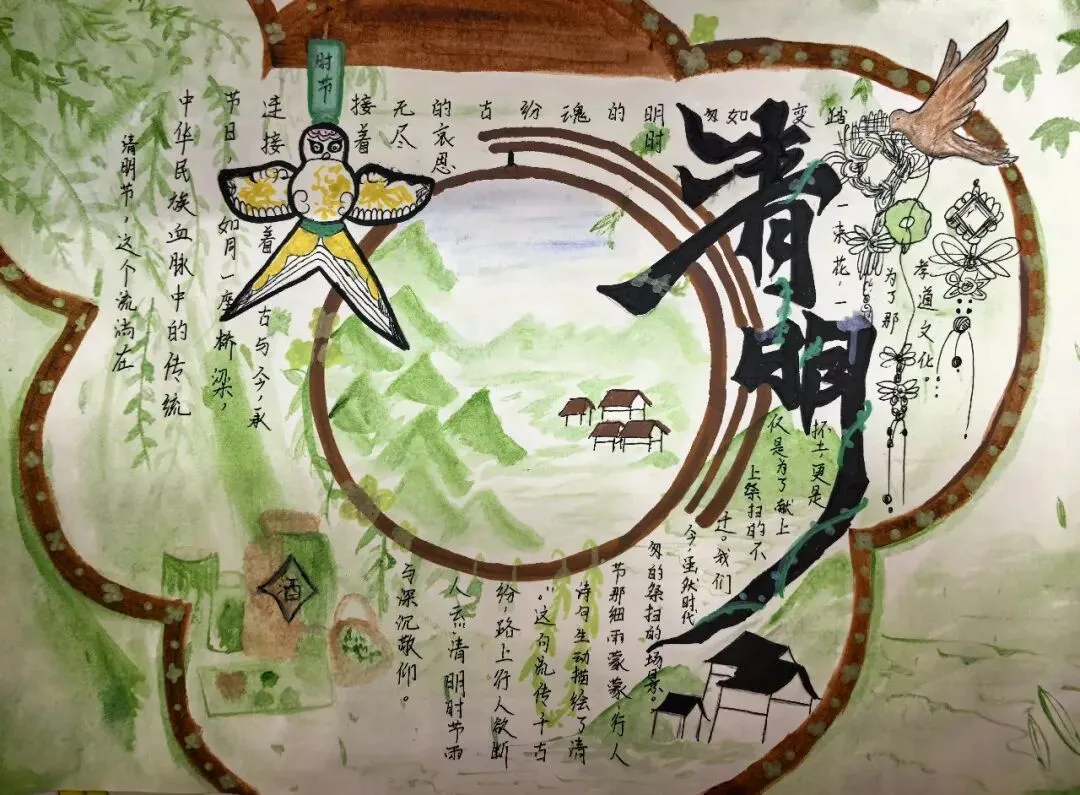 同学们踊跃参与、匠心创作,以缅怀先烈、春日踏青、诗词雅韵、民俗传承为核心,巧思构图、精设版面,用灵动的色彩勾勒踏青插柳的盎然意趣,以工整的笔墨书写扫墓祭祖的肃穆深情,将经典诗词的隽永韵味、传统习俗的文化内涵、英烈事迹的精神力量,一一铺展于纸端。