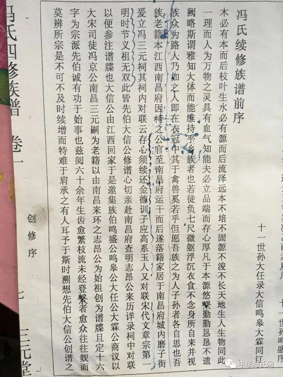 我们是湖北孝感市冯氏族,今请求全国冯氏高才们,帮忙我们看一下和对照一下,帮我们提高参考信息。由于我族在道光年间重修族谱时,我孝感十一世祖大信公,听前辈说我们祖籍来自江西南昌府磨子街,因老谱失传,大信公为我族修谱寻找江西祖籍证据根源,所以在道光五年大信公亲赴南昌查询,由于相隔迁孝感的一世祖二百多年,大信去时没有找到,但当时南昌府磨子街确实有个三元祠,祠中还有两幅对联,(下图片中有)这是我十一世祖亲眼所见,我今请求的目的是要各位知情的人给我们对照一下,是否有其他冯氏族谱上也注明了这个三元祠古时确实存在,全国各地宗亲们谱上是否也有说明和记载,这个三元祠是否在谁的谱上有相同的记载。是哪支先祖所建?下面我载原文发给各位宗亲看下。