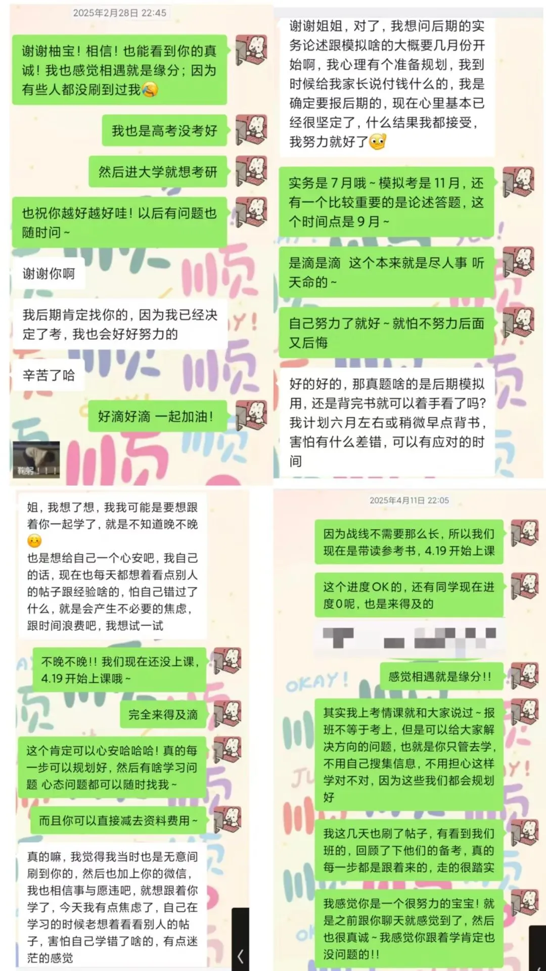 这是当时和这个学妹的沟通记录,印象特别特别深刻,因为当时就感受到她特别真诚!(不过大家都挺好的哈)虽然一开始拒绝了我,但也让我非常舒心的那种~而且在四月份报名的时候,我就已经看出来了她的那种韧性,只要坚持下去,大概率是能考上的!