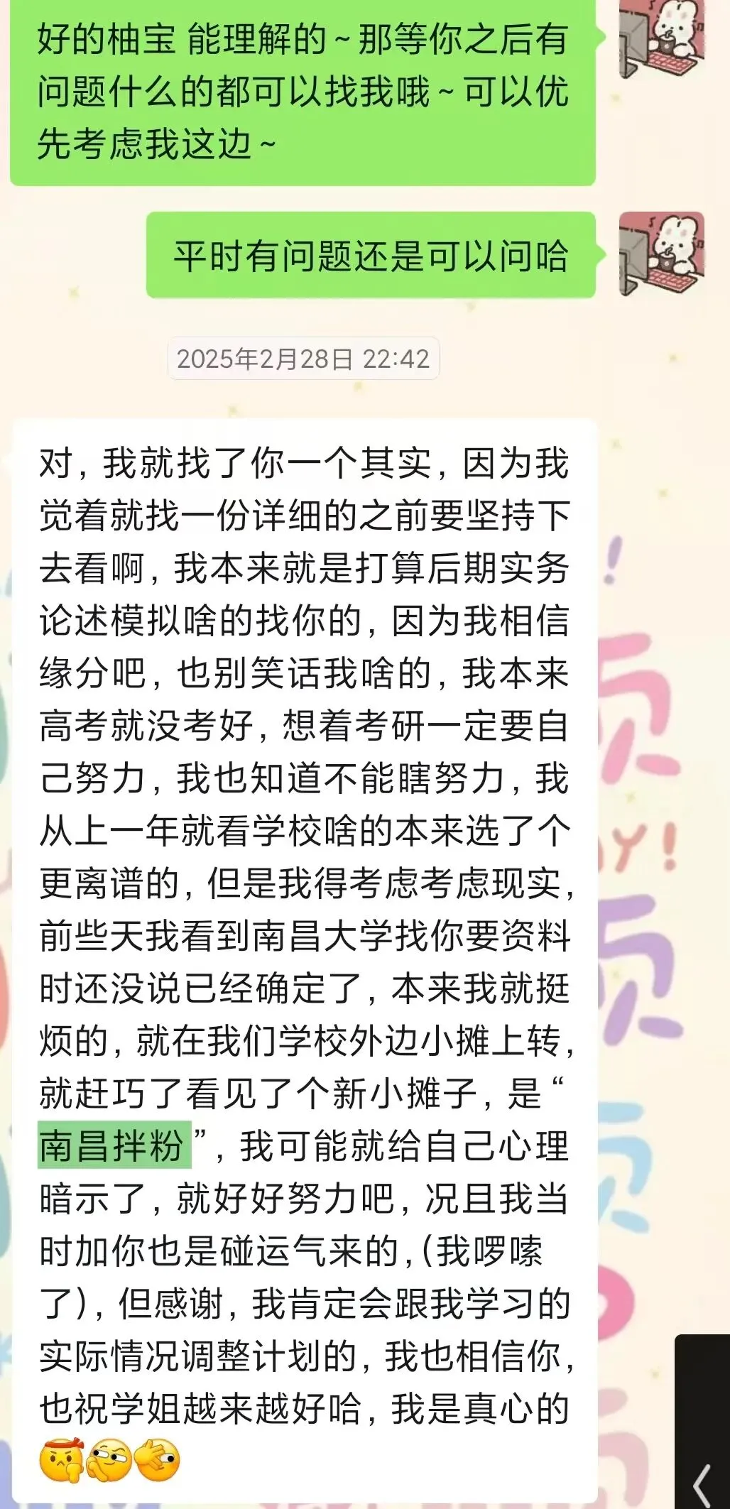我本人高考失利,一直有考研的想法,2025年3月左右开始物色学校,突然间刷到了学姐的帖子后开始聊天,后来也是种种缘分,选择了南昌大学。南昌大学专业课书本数量少且近几年也不压分,本人还存在一个92梦就选择了南昌大学,开始进行备考(现在回想也是幸运遇见了学姐一步一步走下来)