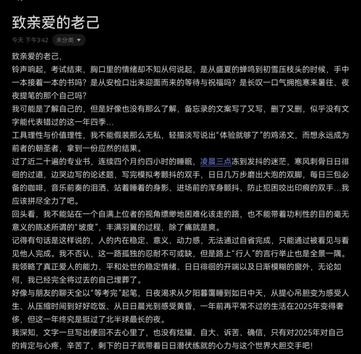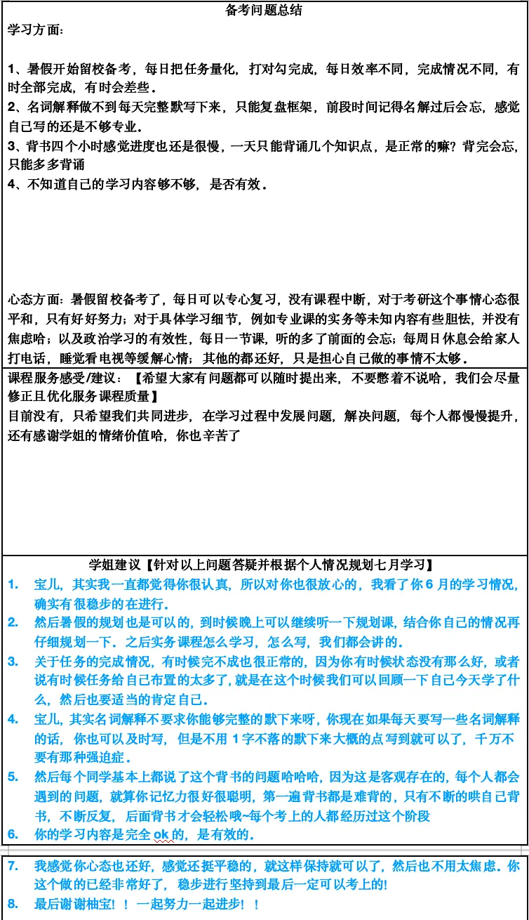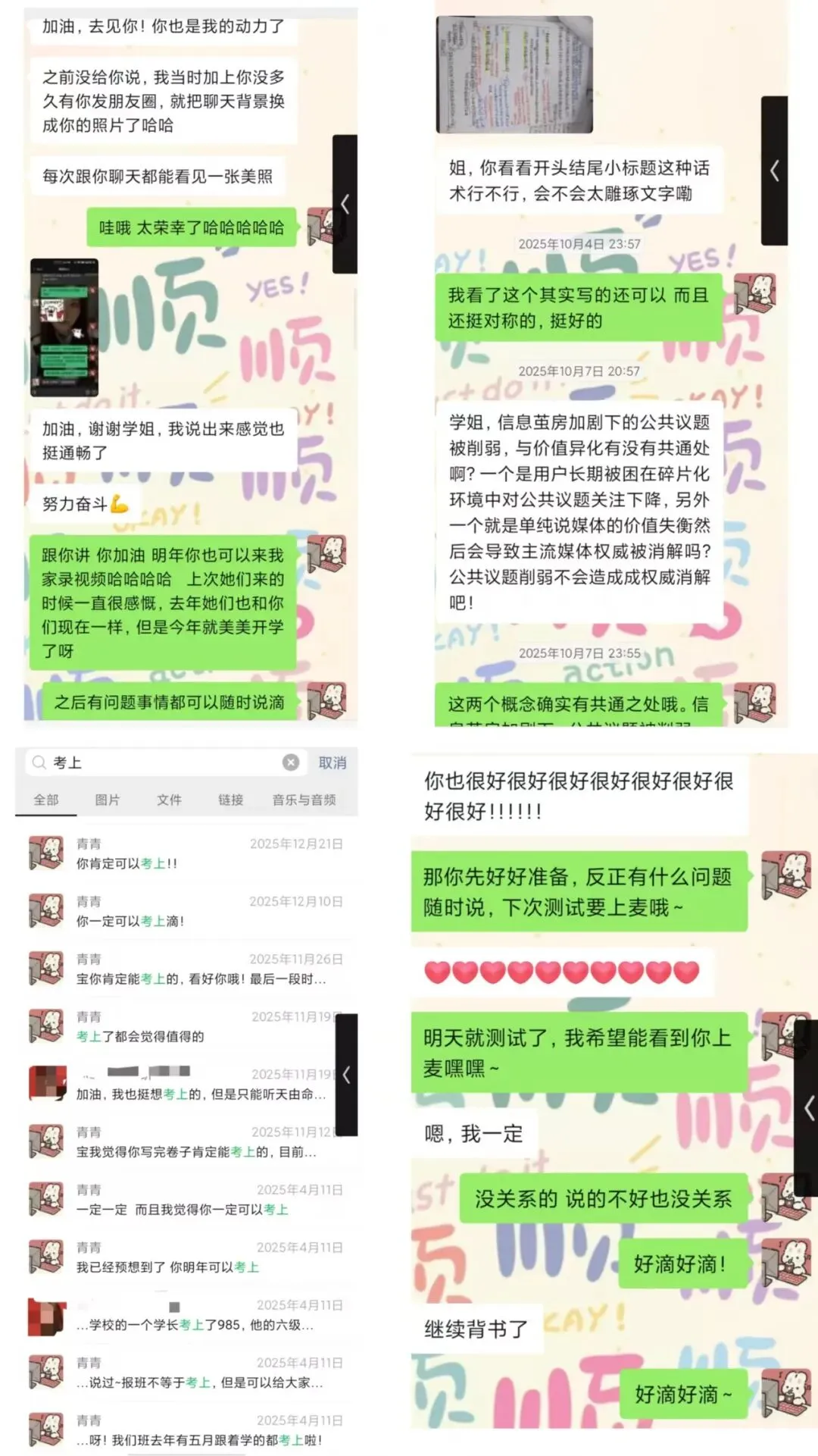 备考这一年,我们不仅是学姐学妹,更像是并肩作战的战友。截图里那些鼓励、关于实务写作的反复打磨、还有她拿到高分时激动的反馈,都是我们共同的独家记忆。给27届学弟学妹的建议:不要担心开始得晚,也不要害怕基础差。