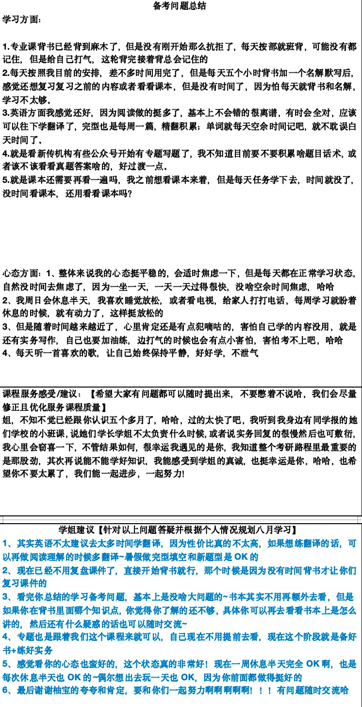 刚开始写时写题会比较难,可能会出现几个小时写一篇作业的情况,但不要焦虑,这都是正常的,这些所有的时间都会沉淀为自己的知识积累,结果都不会辜负自己的努力的。(学姐会按时教授实务类型,并布置相应作业,可根据学姐的批改进行修正,按部就班的即可,并且学姐也会耐心的抚慰我的情绪,在我备考路上给我加油鼓励)