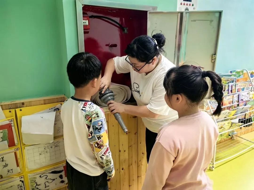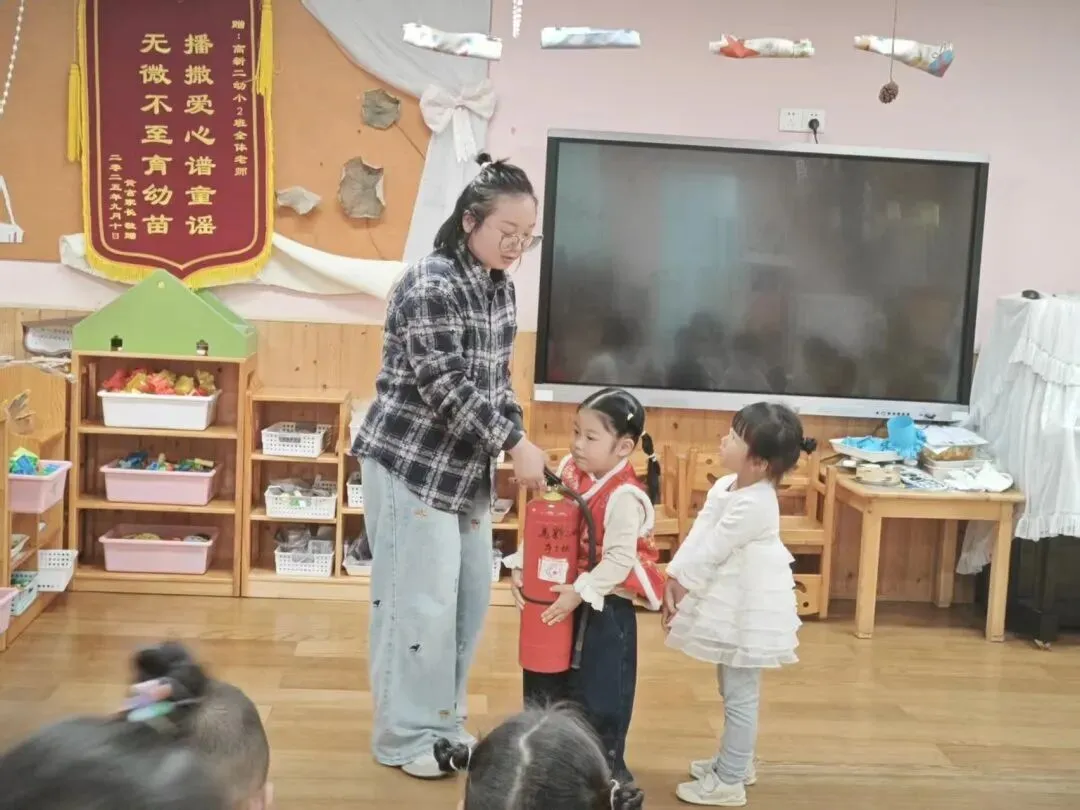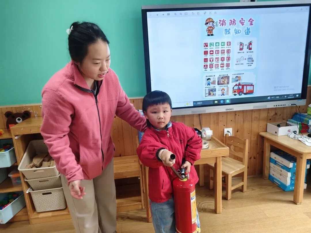 同时,老师还手把手教孩子们认识灭火器,讲解“提、拔、握、压”的使用步骤,并邀请小朋友亲自体验操作,让孩子们在实践中掌握灭火技能,真正做到“知消防、学消防、懂消防”。