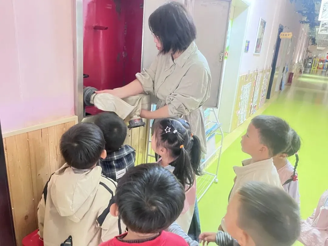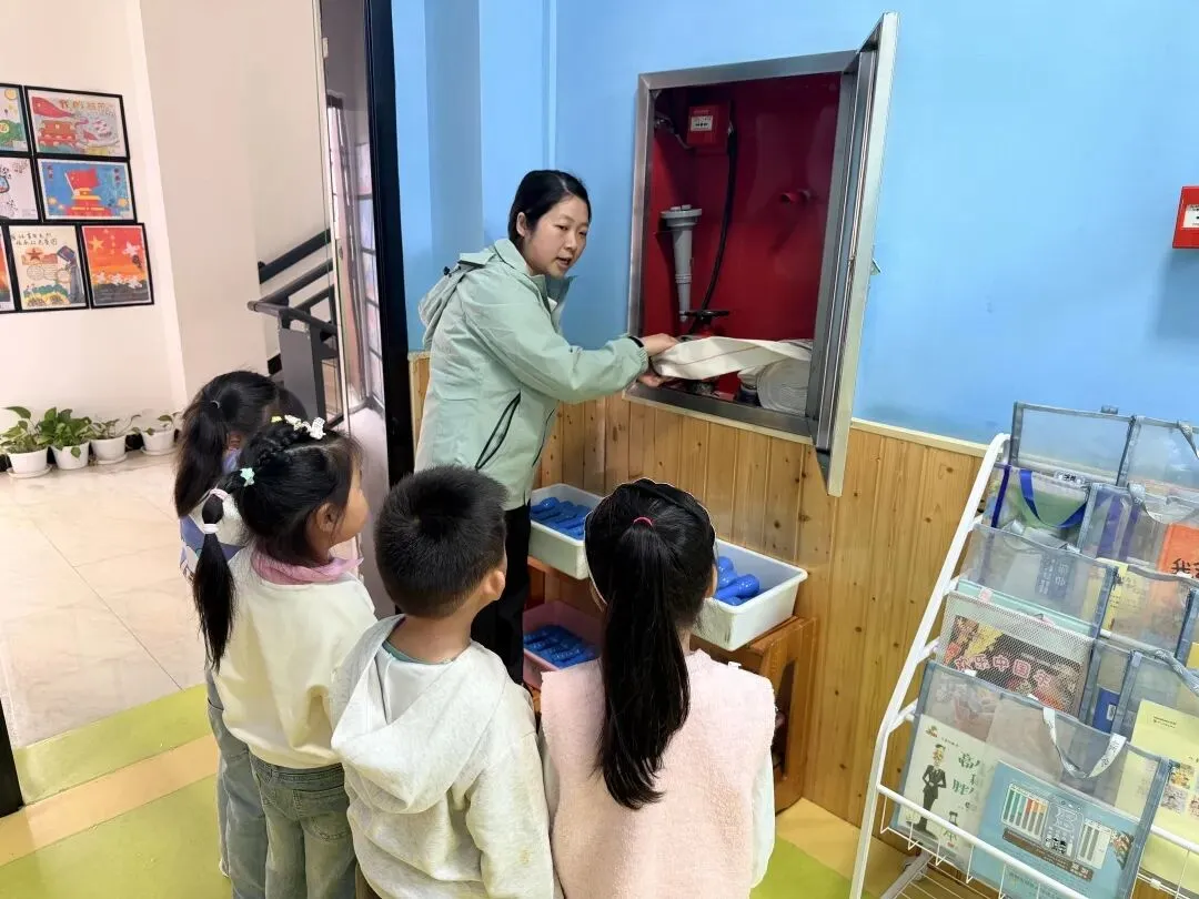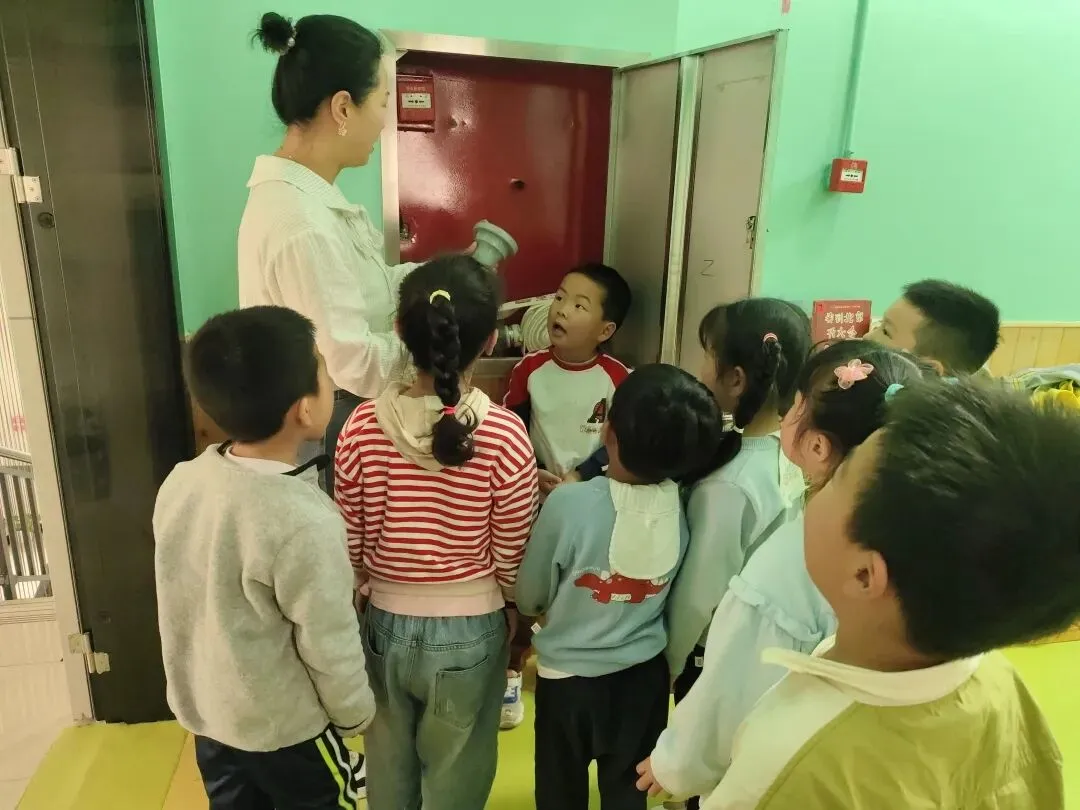“小朋友们,这个柜子里藏着什么呢?”老师带领孩子们近距离认识消防栓,详细讲解消防水带、接口的作用和使用方法,让孩子们直观了解消防设施的用途,认识身边的“安全卫士”。