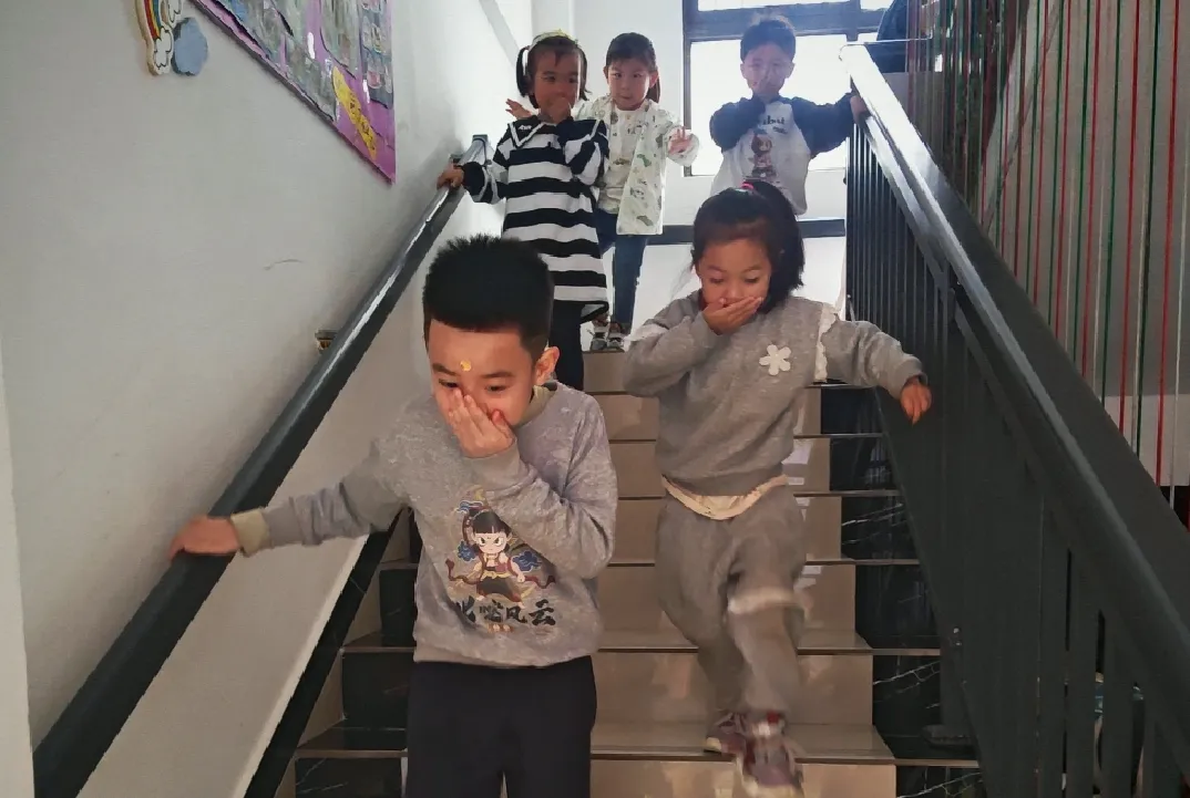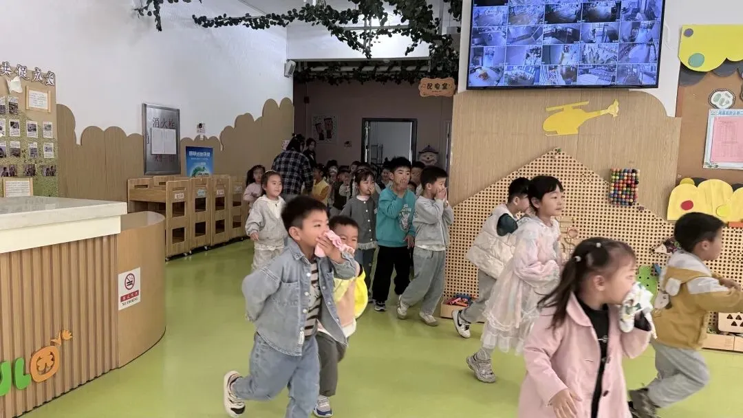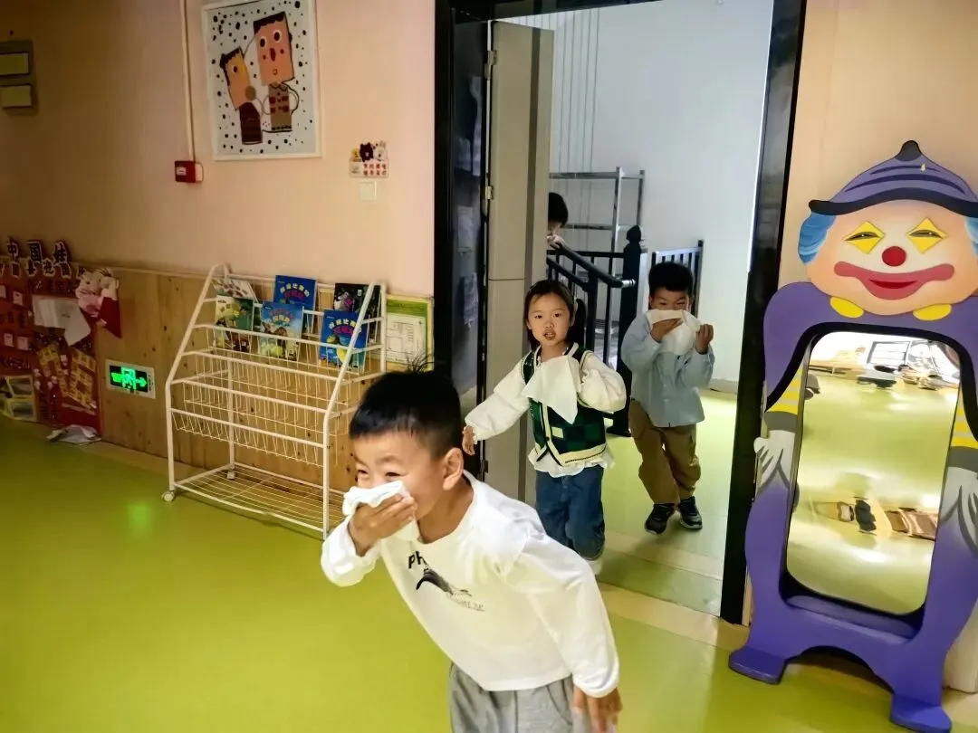 随着警报声响起,消防疏散演练正式开始!各班教师立即组织幼儿用湿毛巾捂住口鼻,弯腰低姿,沿着预定疏散路线,快速、有序地撤离教室。整个过程紧张而有序,孩子们听从指挥、不推不挤,以最快的速度撤离到操场安全区域。