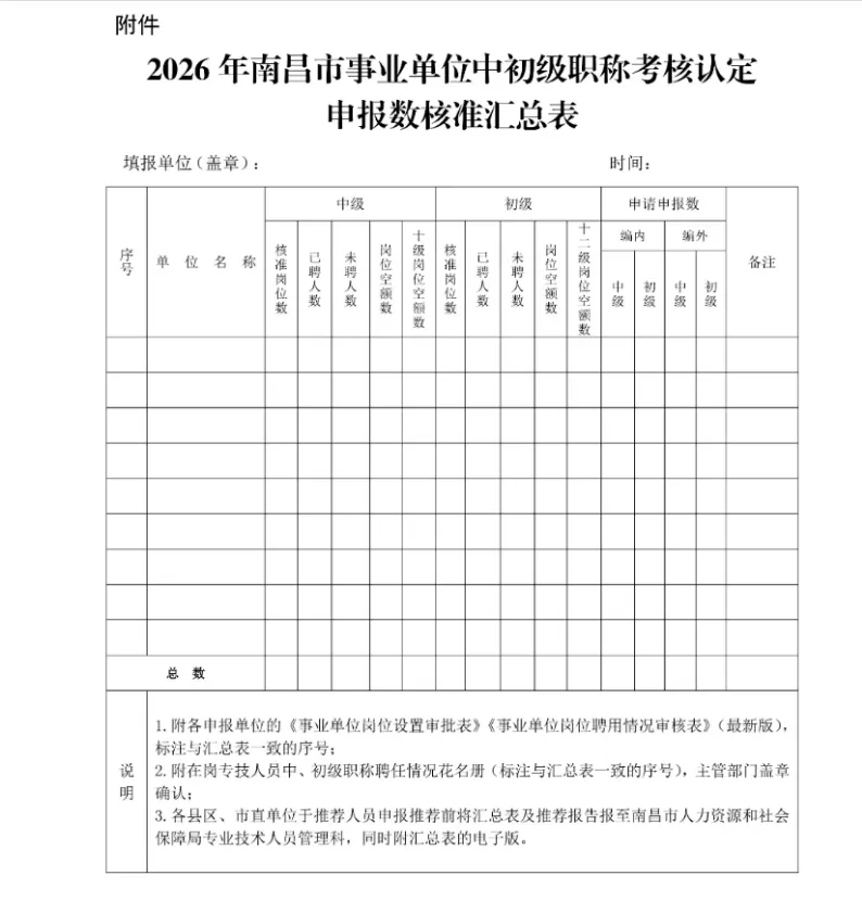 附件:2026年南昌市事业单位中初级职称认定申报数核准汇总表