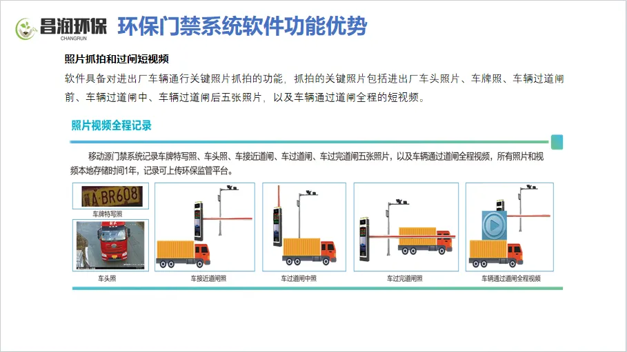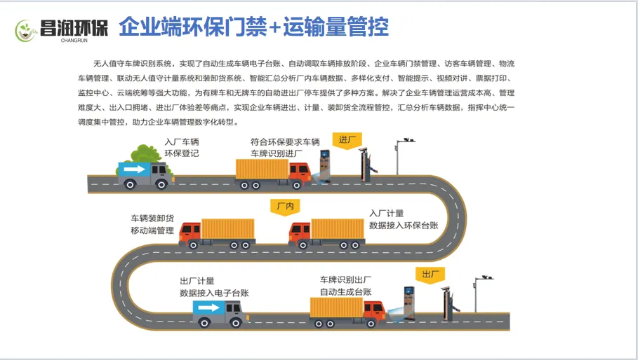 数据处理 | 通行数据一般存储在本地服务器或存储设备中,主要用于企业内部的查询、审计和安全追溯,数据的共享性和实时性相对较低。 | 所有车辆通行数据实时上传至政府环保监管部门指定平台,形成电子台账,数据具有不可篡改、可追溯性,便于政府部门实时掌握企业移动源污染管控情况,为环保决策提供数据支持。 |