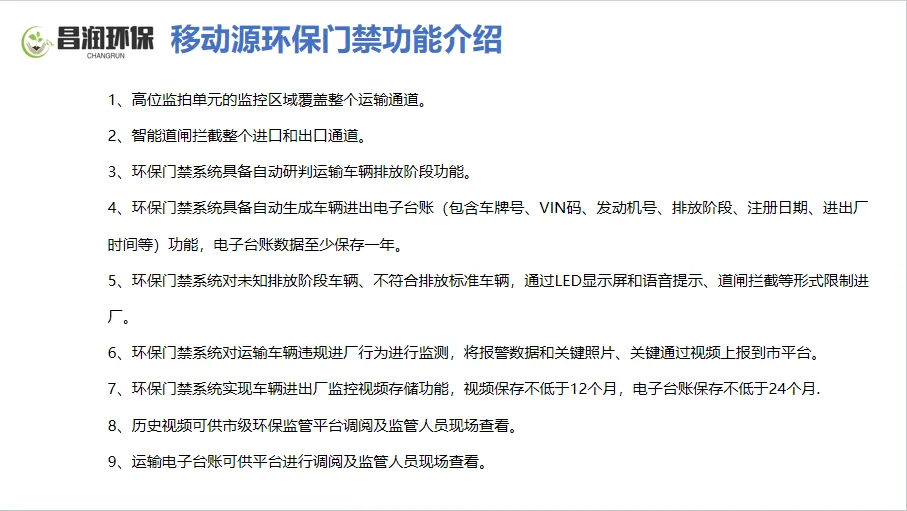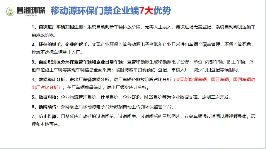 判断标准 | 依据预先设定的授权名单,只要人员或车辆在授权范围内,即可通行,主要考虑安全管理层面的通行许可。 | 依据车辆的环保标准,即使车辆在企业的通行授权名单内,但如果排放不达标(如老旧的低排放标准车辆),也会被禁止通行,侧重于环保合规性判断。 |