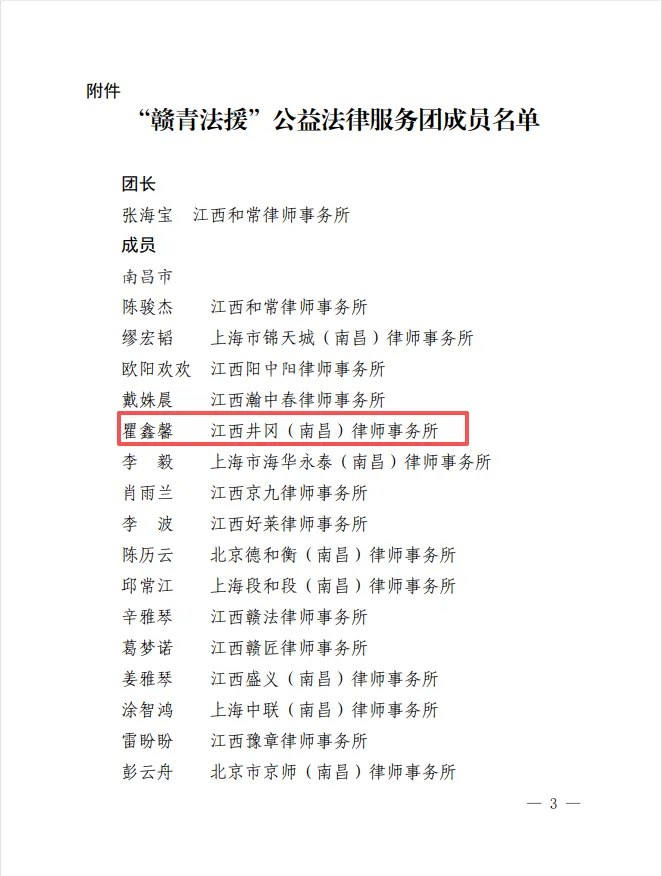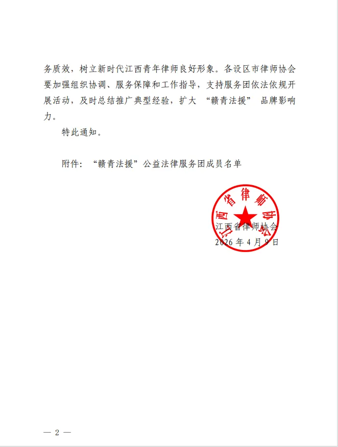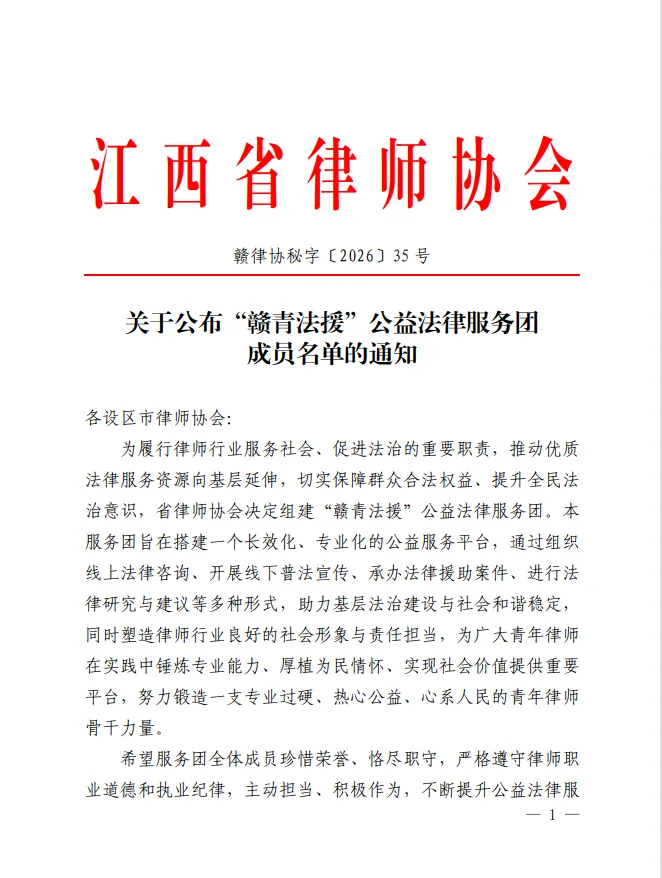 2026年4月9日,江西省律师协会正式公布“赣青法援”公益法律服务团成员名单,经严格遴选与综合评定,井冈南昌分所权益高级合伙人、主任瞿鑫馨光荣入选“赣青法援”公益法律服务团。
