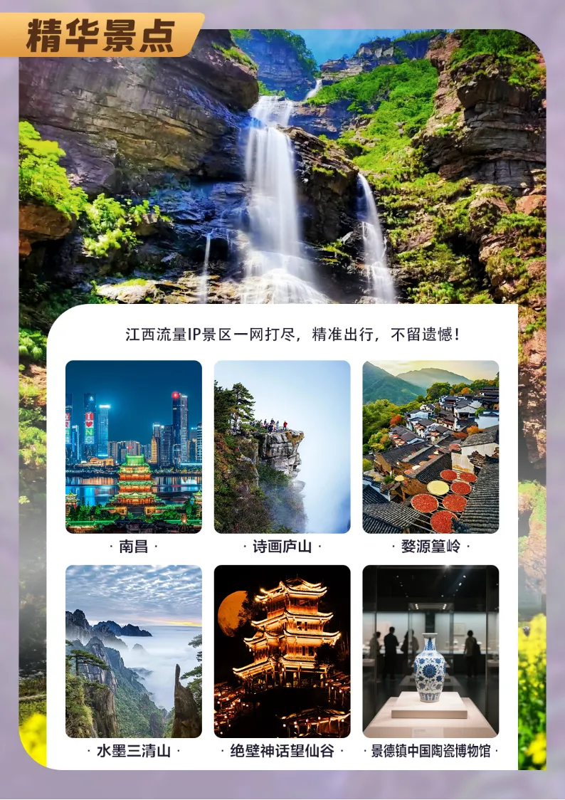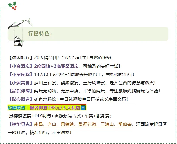 1.江西气候:江西多属于山地丘陵地带,天气多变,早晚温差大,请携带好相应衣物及雨具等。2.江西餐饮:江西以赣菜为主,味重喜辣偏咸,团队餐本地口味为主,有特殊餐饮要求需提前交待。3.文明旅行:请遵守文明旅游公约,尽量避免冲突,如因游客个人行为引发冲突者,责任自行承担。4.关于行程:因天气自然灾害堵车等不可抗力因素造成团队行程更改、延误、滞留或提前结束时,旅行社可根据当时的情况全权处理,如发生费用增减,未发生费用退还游客,超支费用由游客自行承担。旅行社在不减少景点不降低标准情况下有权根据实际情况调整行程先后顺序。5.安全原则:此行程爬山项目较多,请务必注意安排。出门在外,贵重物品请随身携带,妥善保管!切莫轻信陌生人免费廉价等诱惑。70周岁以上游客参团,须出示健康证明并与旅行社签订身体健康免责证明,并有家属陪同方可报名。中途离团请填写离团证明及终止旅游合同协议,已经发生费用或已提前预付费用不予退款;离团后,所发生的一切后果游客自行承担;6.联系问题:旅行社工作人员在出团前一天下午会以短信或电话方式通知游客,请注意确认查收,如有航班车次信息出入,请及时提出!如晚上8点后还未收联系,请及时联系报名旅行社。7.车损房差:请合理安排出游时间,如临时取消出行(24小时内)需补交车位损失费100元/人。8.意见反馈:请认真填写意见单,旅游期间对我社接待质量未提出疑议者均视为满意。如旅途中存在疑议,请于当地及时提出合理要求,以便现场核实、及时处理。回程后提出的变相索赔投诉不予受理!旅行社不受理因虚假填写或不填意见单而产生的后续争议和投诉。