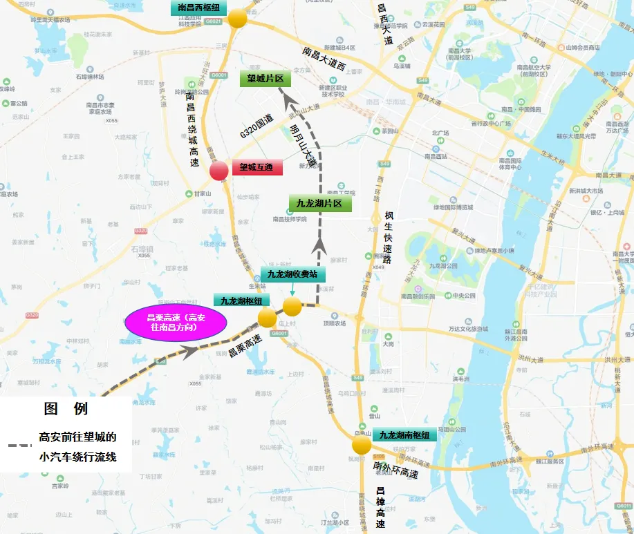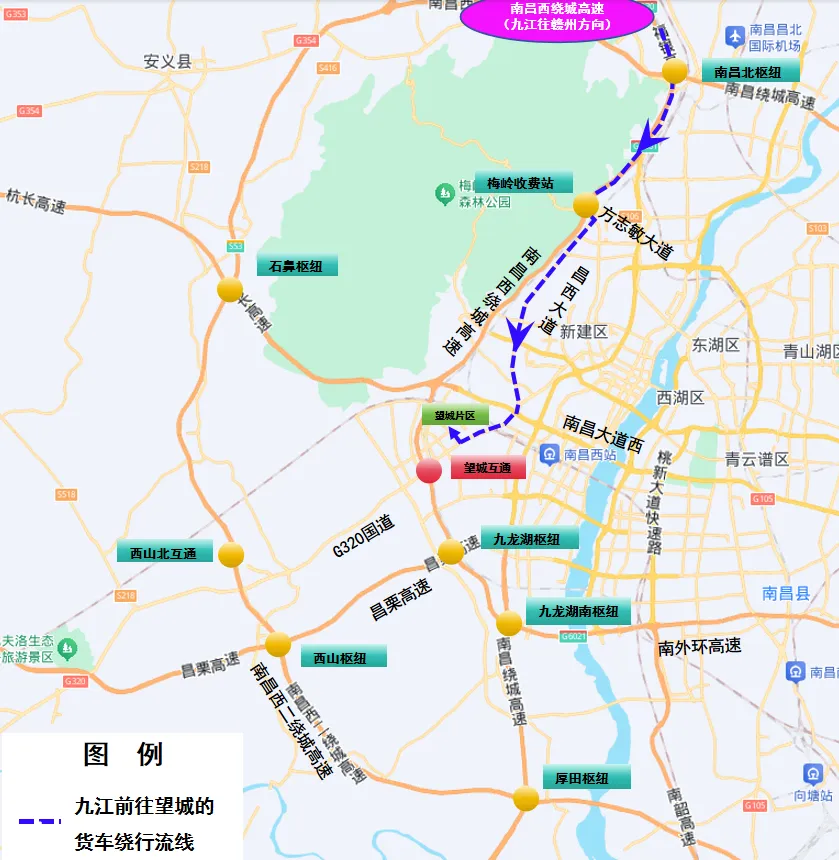 5、高安往南昌方向:昌栗高速→西山枢纽→西山北互通→西山北收费站→G320国道→望城片区