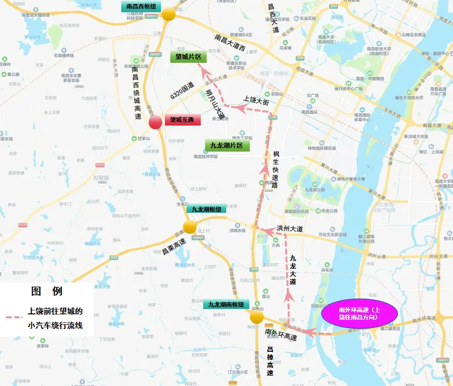 3、上饶往南昌方向:南外环高速→九龙湖南枢纽→九龙湖枢纽→昌栗高速→西山枢纽→西山北互通→西山北收费站→G320国道→望城片区