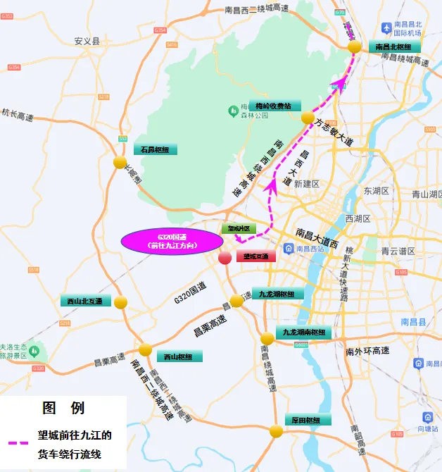 1、南昌往九江方向:G320国道→双云路→昌西大道→方志敏大道→梅岭收费站→南昌西绕城高速