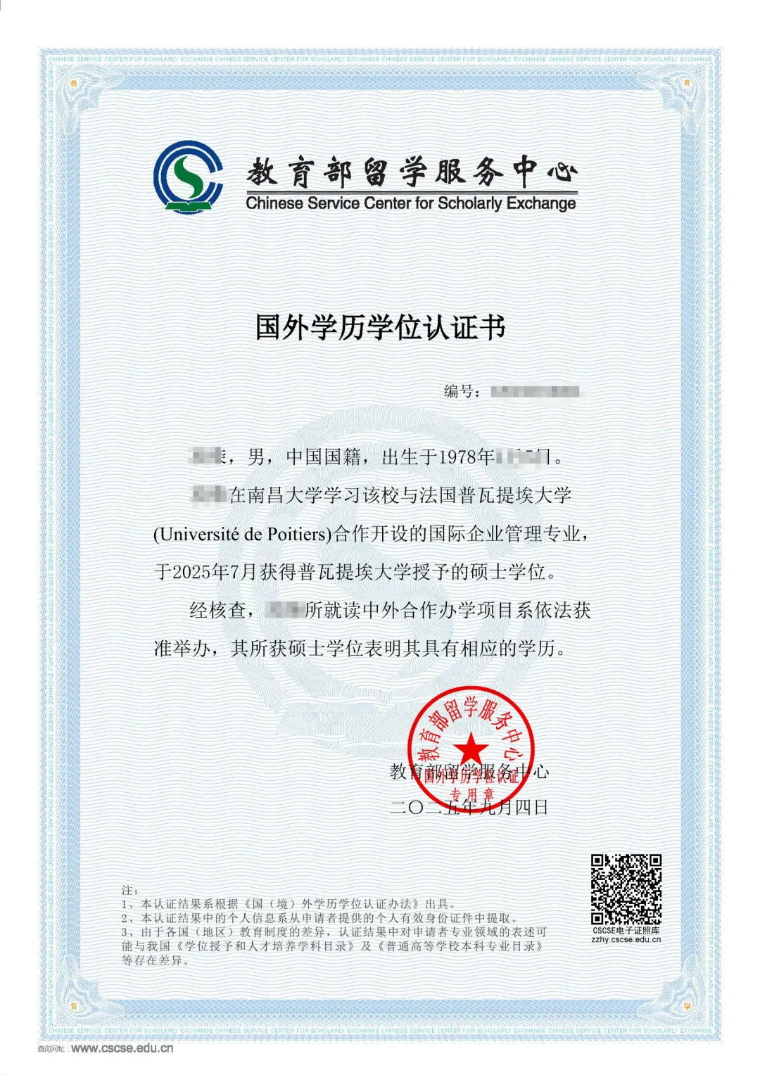教育部留学服务中心国外学历学位认证书样本