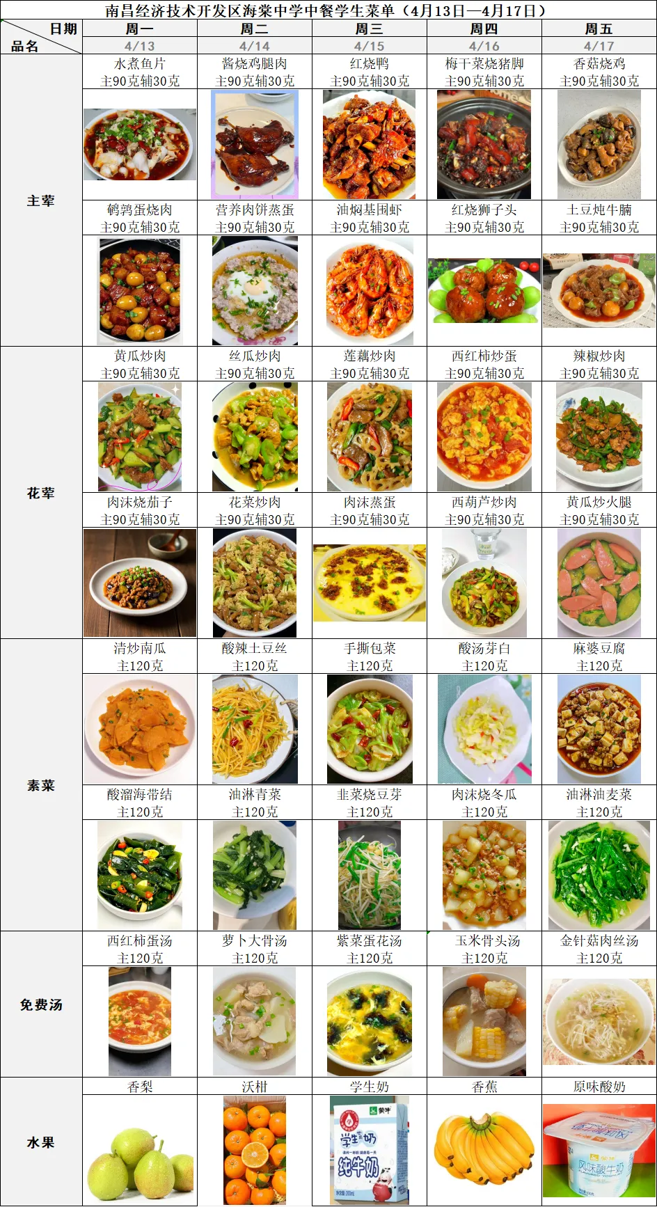 南昌二中经开校区一周食谱公示(4.13--4.17)