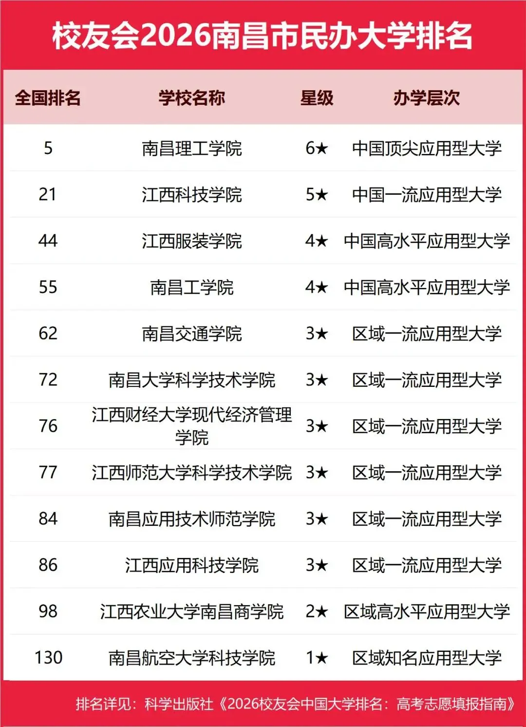 校友会2026南昌市民办大学排名揭晓,区域高等教育格局呈现新气象。南昌理工学院以全国第5名、6星级评价蝉联本土榜首,彰显顶尖应用型大学实力。江西服装学院(第44名)、南昌工学院(第55名)均获评4星级高水平大学,特色发展路径清晰。江西科技学院(第21名)稳居南昌地区第二,江西应用科技学院(第86名)、江西农业大学南昌商学院(第98名)等院校也持续提升办学水平。本次排名中,南昌交通学院(第62名)、江西师范大学科学技术学院(第77名)表现亮眼,分列南昌地区第五与第八位,进步显著。