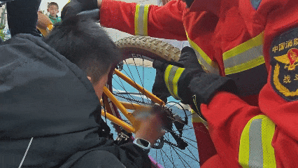 消防员将男孩的手指从自行车中取出