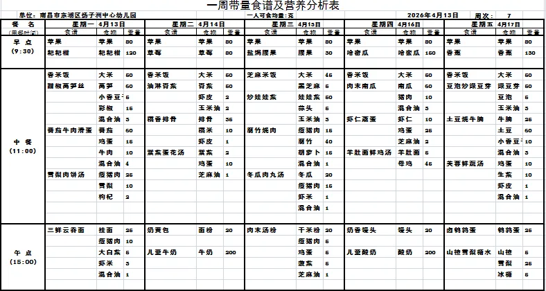 南昌市东湖区扬子洲中心幼儿园每周食谱(04月07日-04月10日)