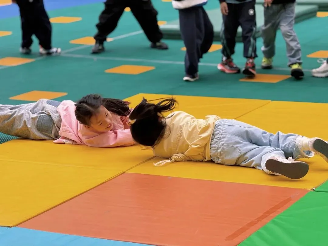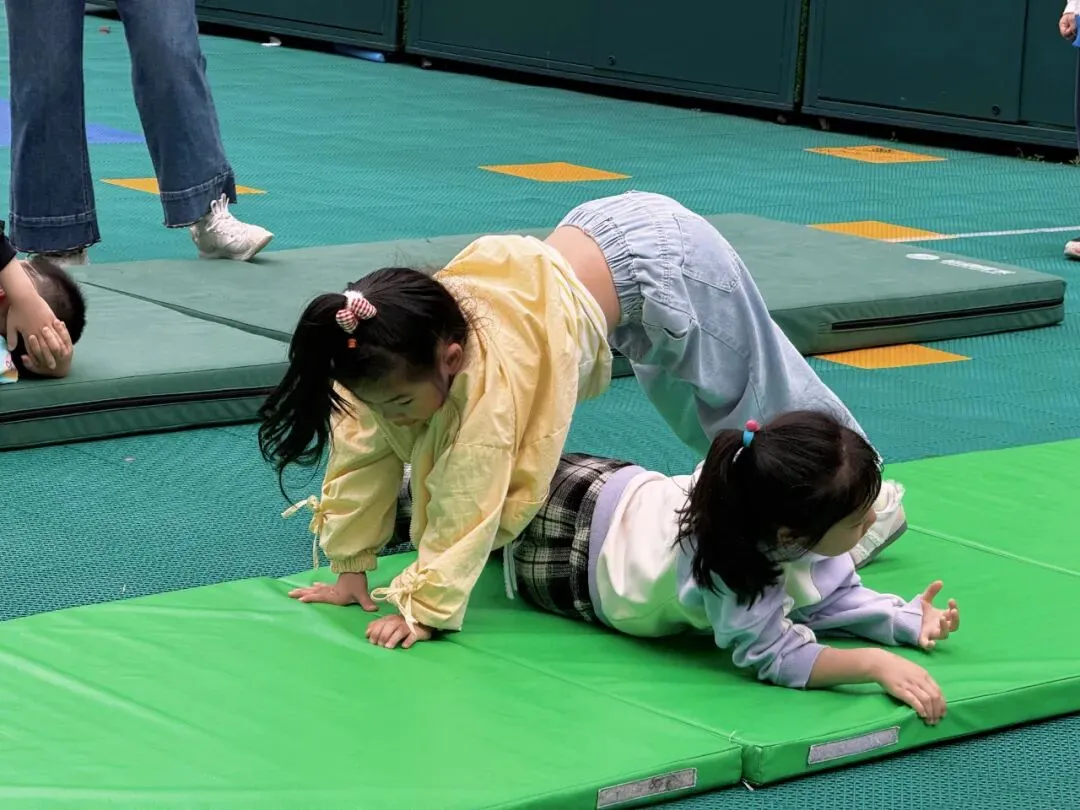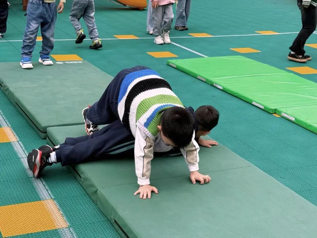 活动亮点:教师全程以观察者、引导者、支持者的身份参与活动,观察敏锐且指导精准。在幼儿自由探索时,及时点评不同玩法并给予肯定;在动作练习时,用 “小螃蟹一样稳稳爬”“直直的小木头滚” 等形象化语言讲解要领,降低了动作理解难度;在合作游戏中,针对幼儿配合问题及时提示 “一二一” 口令,帮助幼儿调整动作同步性。互动中注重鼓励,对动作标准、合作默契的幼儿及时点赞,保护了幼儿的参与热情与自信心。