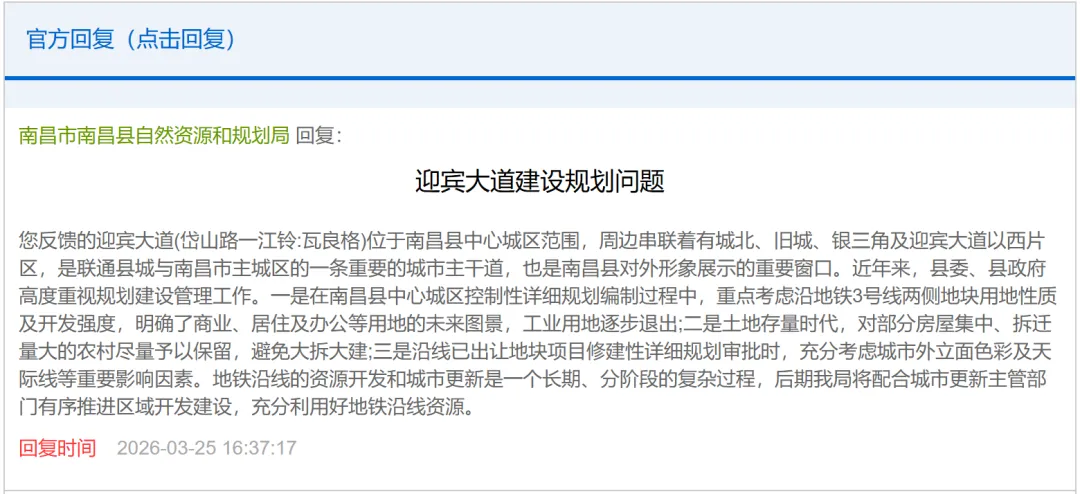 南昌市南昌县自然资源和规划局回复: