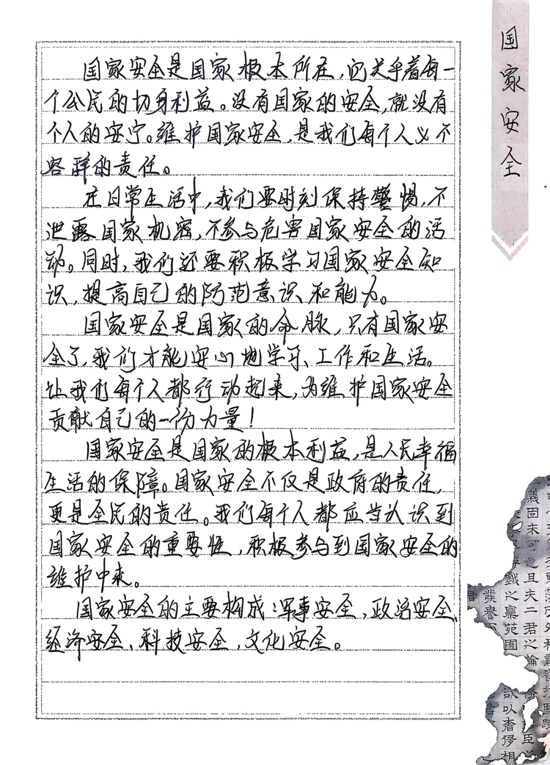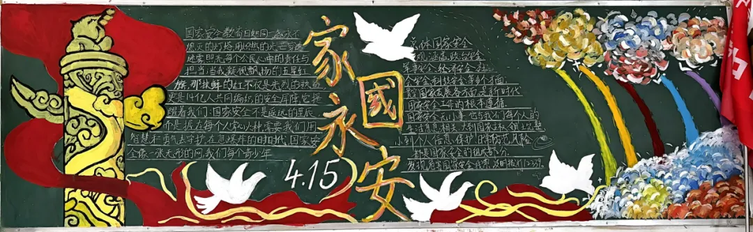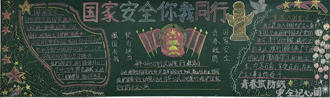 学校面向全校征集国家安全主题插画、漫画、手抄报、书法等作品,鼓励学生以艺术形式表达安全理念,并评选一、二、三等奖予以表彰。各班级精心制作国家安全主题黑板报,普及安全知识与相关法律法规,让安全意识融入日常校园文化。