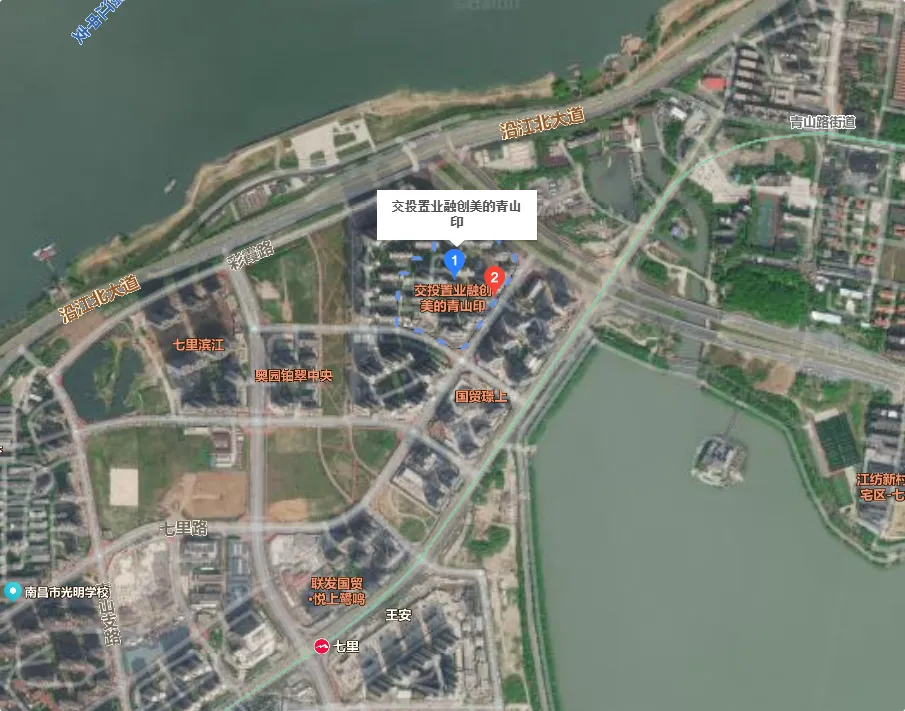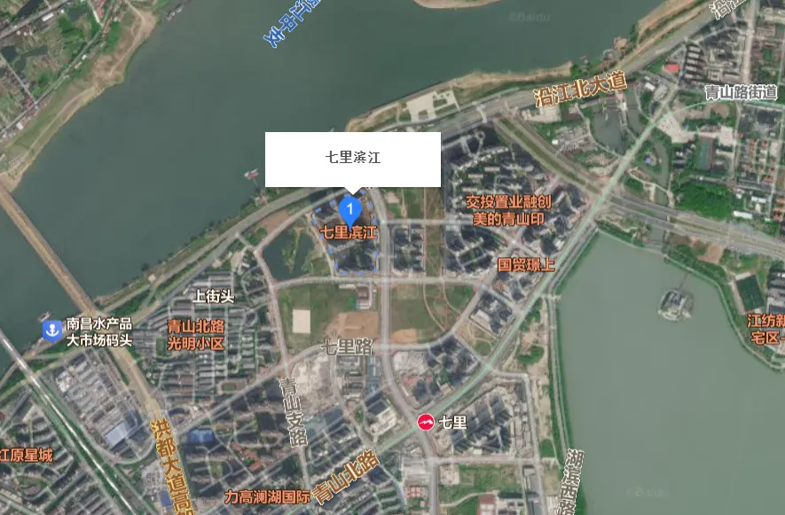 七里滨江处在在青山湖西岸,位置靠近沿江北大道。距离四号线七里站大概是500多米,项目南面就是已经动工的豫章总校。