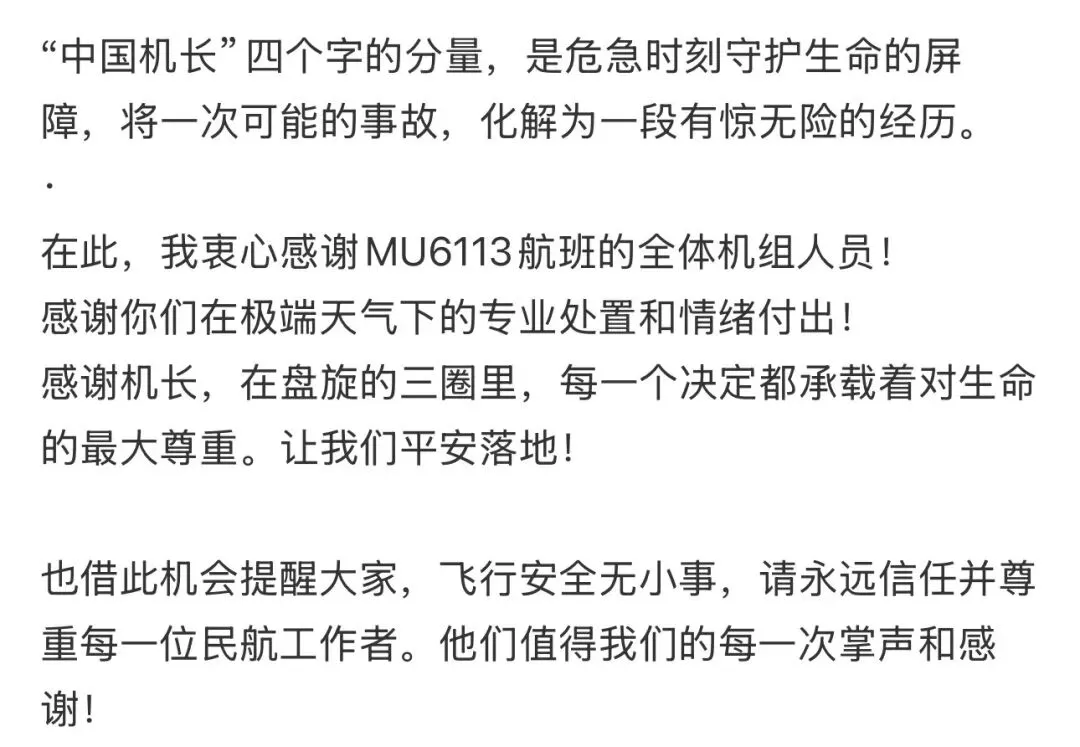 她同时表示,在恐惧中,机组人员一次次通过广播安抚乘客,告知“颠簸在可控范围内”,给足了安全感。“飞机平稳落地的那一刻,客舱里响起由衷的感谢声,那是对生命的庆幸,也是对机组人员的致敬。”她特别感谢全体机组人员在极端天气下的专业处置,感谢机长让飞机平安落地。