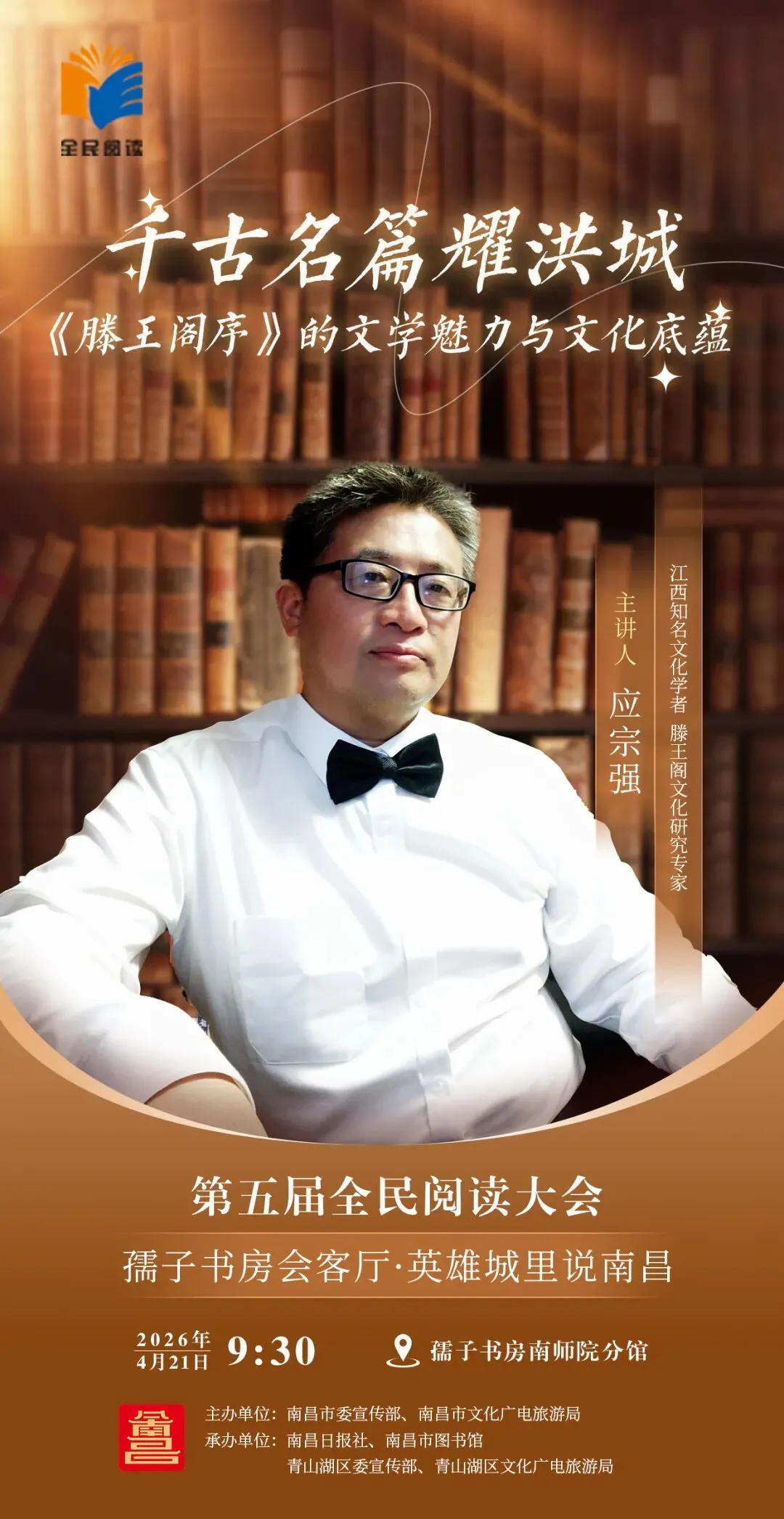 江西知名文化学者、滕王阁文化研究专家应宗强,将落座孺子书房南师院分馆(学生群体专场),带来《千古名篇耀洪城——<滕王阁序>的文学魅力与文化底蕴》主题分享。他将围绕《滕王阁序》解读其千古流传的文学艺术特色,讲述滕王阁与南昌交融共生的文化渊源,带领学生品读经典佳句,感受赣鄱大地的人文盛景。活动还将搭配历史影像、文创展示,融合诵读、赏析等互动形式,让学生沉浸式领略名篇与名楼的双重文化魅力。