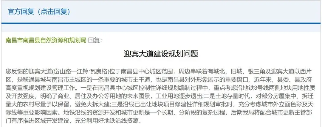 近年来,县委、县政府高度重视规划建设管理工作。一是在南昌县中心城区控制性详细规划编制过程中,重点考虑沿地铁3号线两侧地块用地性质及开发强度,明确了商业、居住及办公等用地的未来图景,工业用地逐步退出。