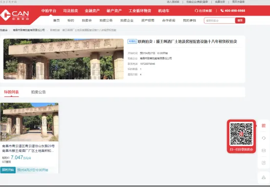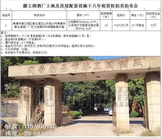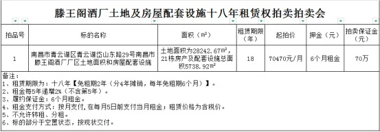 拍卖标的:南昌市青云谱区青云谱岱山东路29号南昌市滕王阁酒厂厂区土地面积和房屋配套设施(土地面积为28242.67㎡,21栋房产及配套设施总面积5738.92㎡)十八年租赁权。