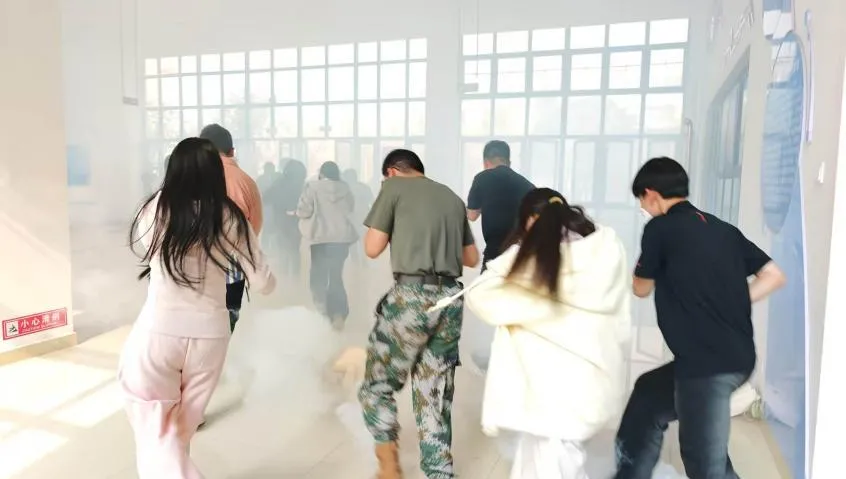随后开展的应急疏散演练中,参与师生按预定路线弯腰捂鼻、快速有序撤离至安全区域,完成人数清点,全程紧张有序、高效规范。实操环节,消防员现场示范灭火器“一提、二拔、三握、四压”的标准操作流程,师生代表轮流上场实操,近距离学习初期火灾扑救技巧。